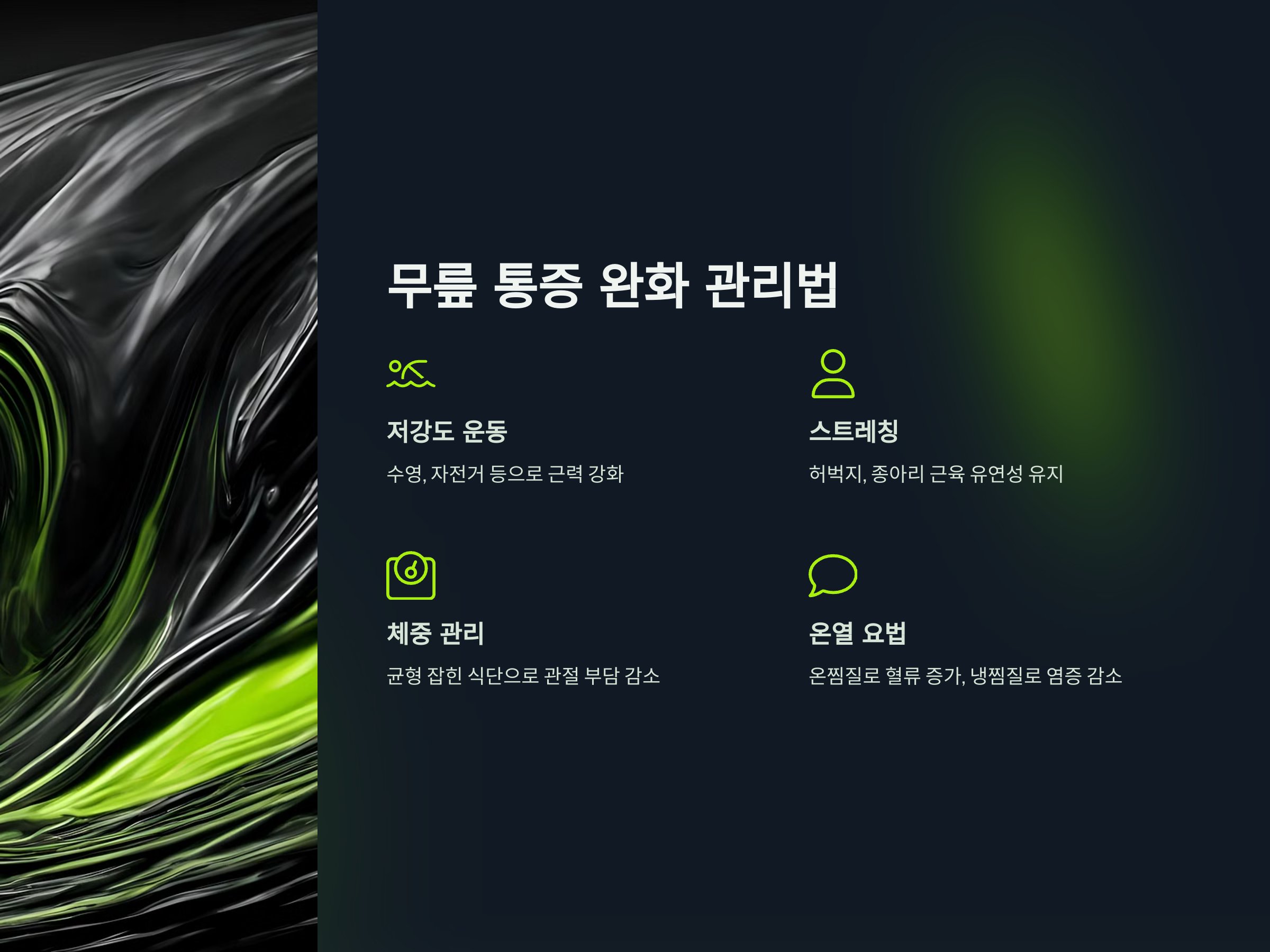 - 무릎 주변 근육을 강화하면 관절 부담을 줄일 수 있습니다.