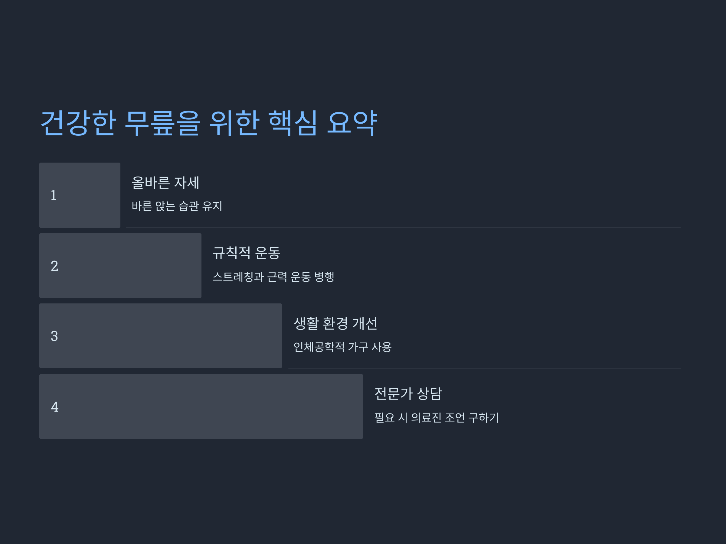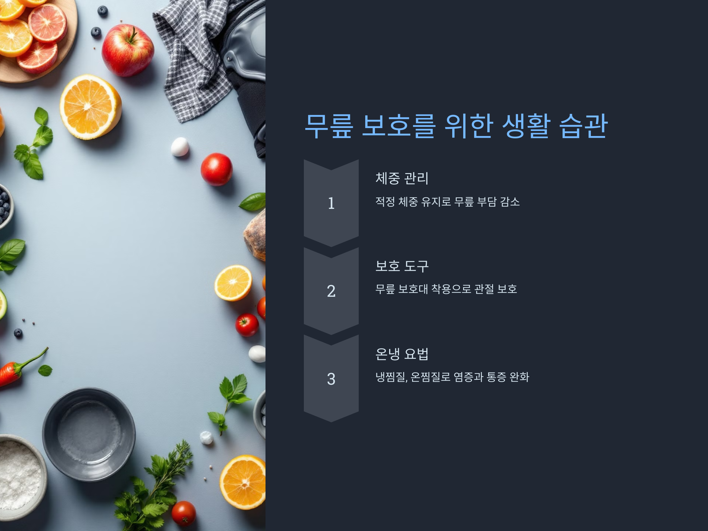 생활 습관의 변화는 무릎 건강을 장기적으로 개선하는 열쇠입니다.