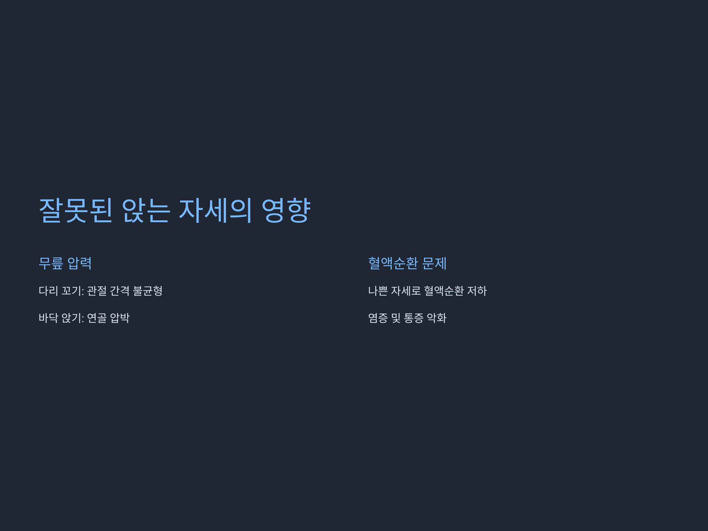 나쁜 자세는 무릎 주변의 혈액순환을 저하시켜 염증 및 통증을 악화시킬 수 있습니다.