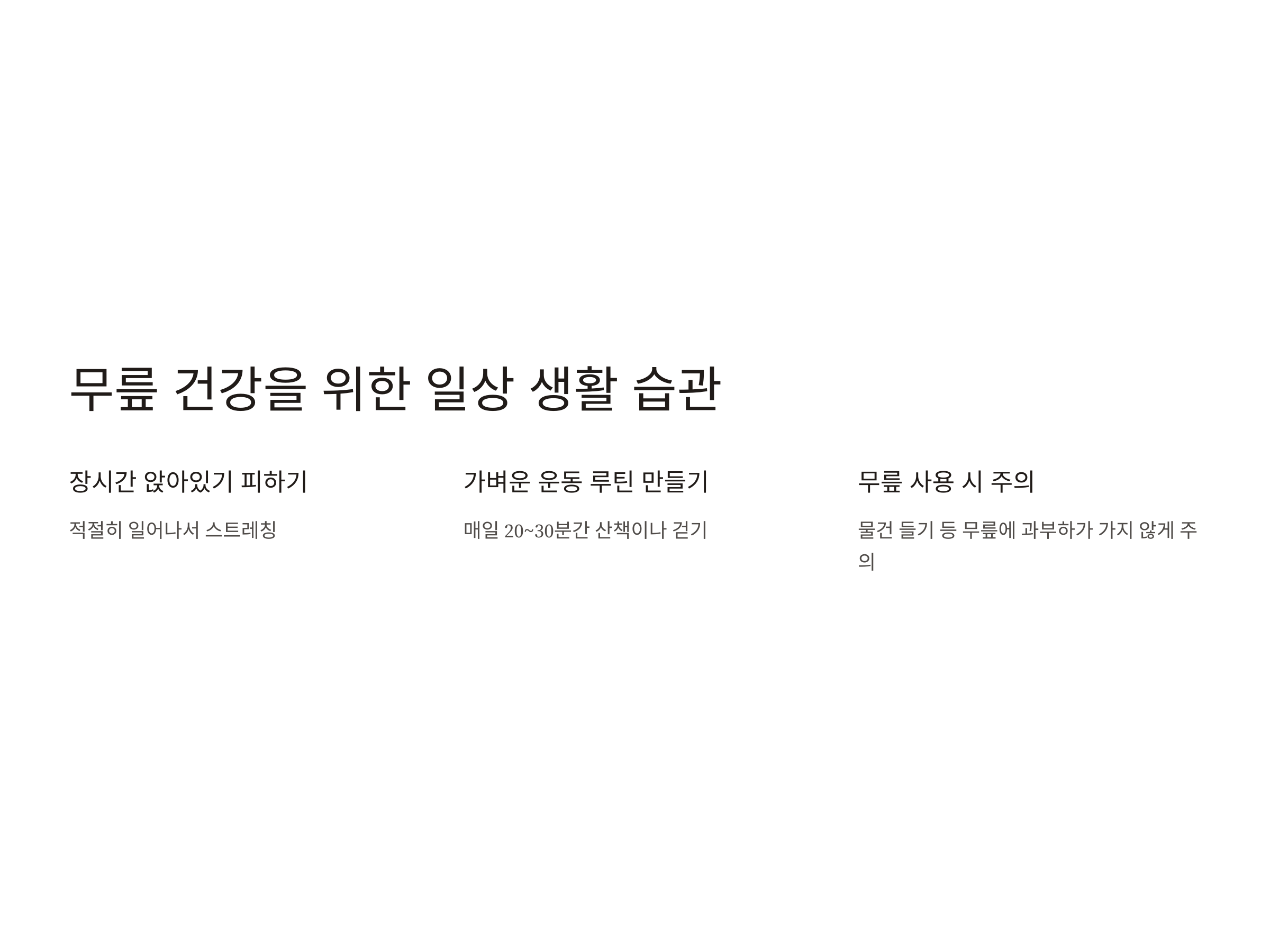 - 무릎 사용 시 주의: 물건 들기 등 무릎에 과부하가 가지 않게 주의.