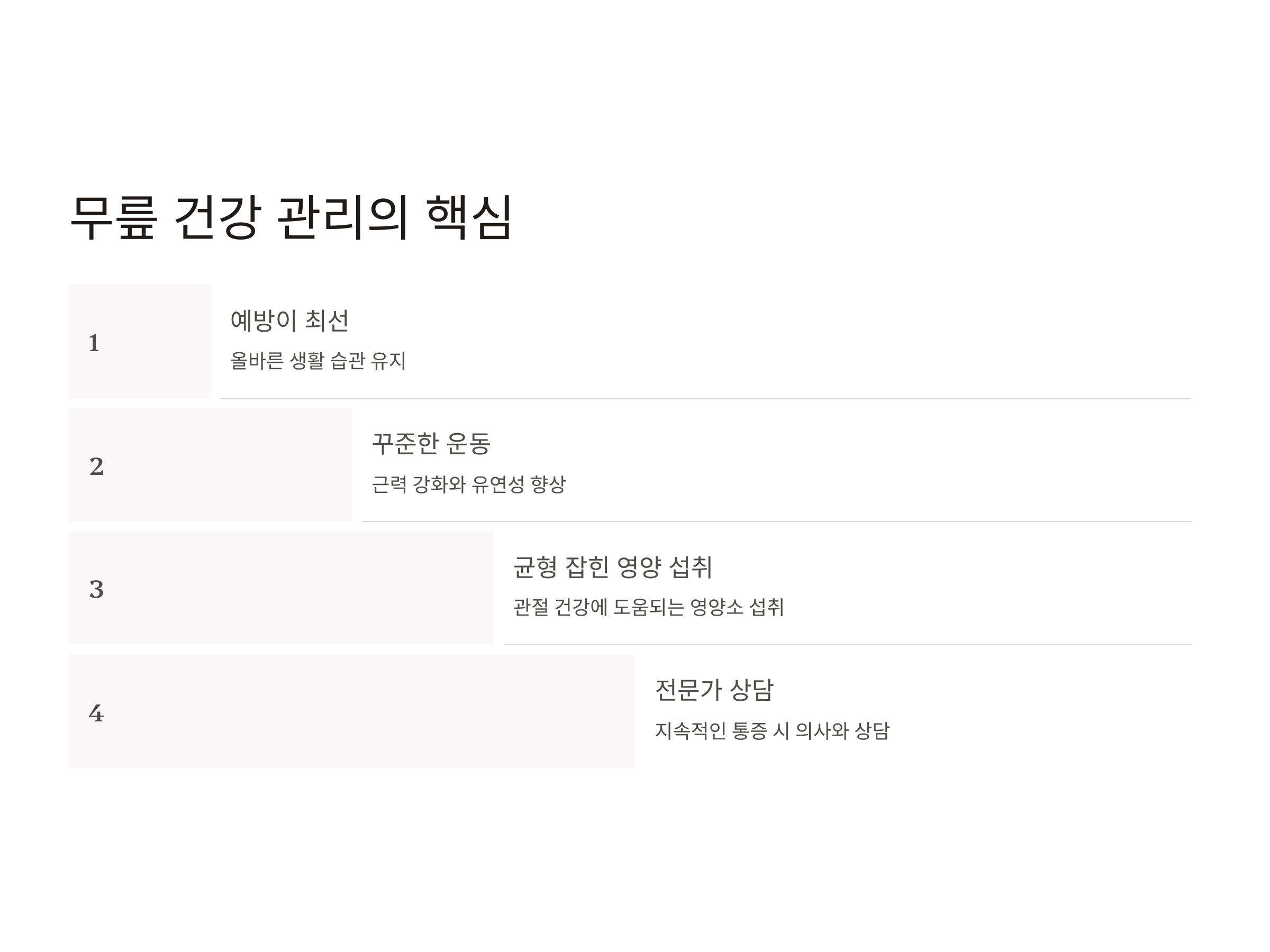 무릎 건강을 지키기 위해 예방은 가장 중요한 단계입니다. 올바른 생활 습관을 유지하는 것이 통증 발생을 줄이는 열쇠입니다.
