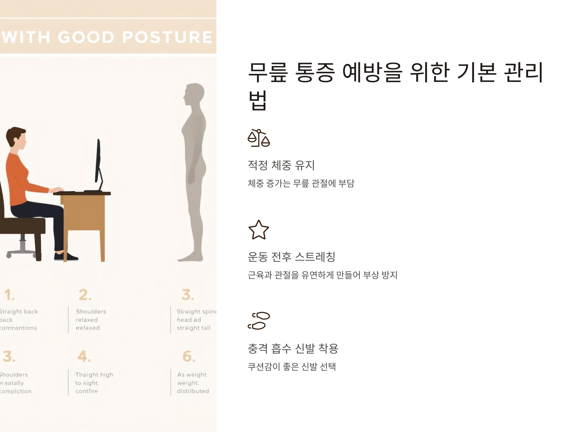 - 바른 자세 습관: 앉거나 일어설 때 무릎이 비틀리지 않게 주의.
