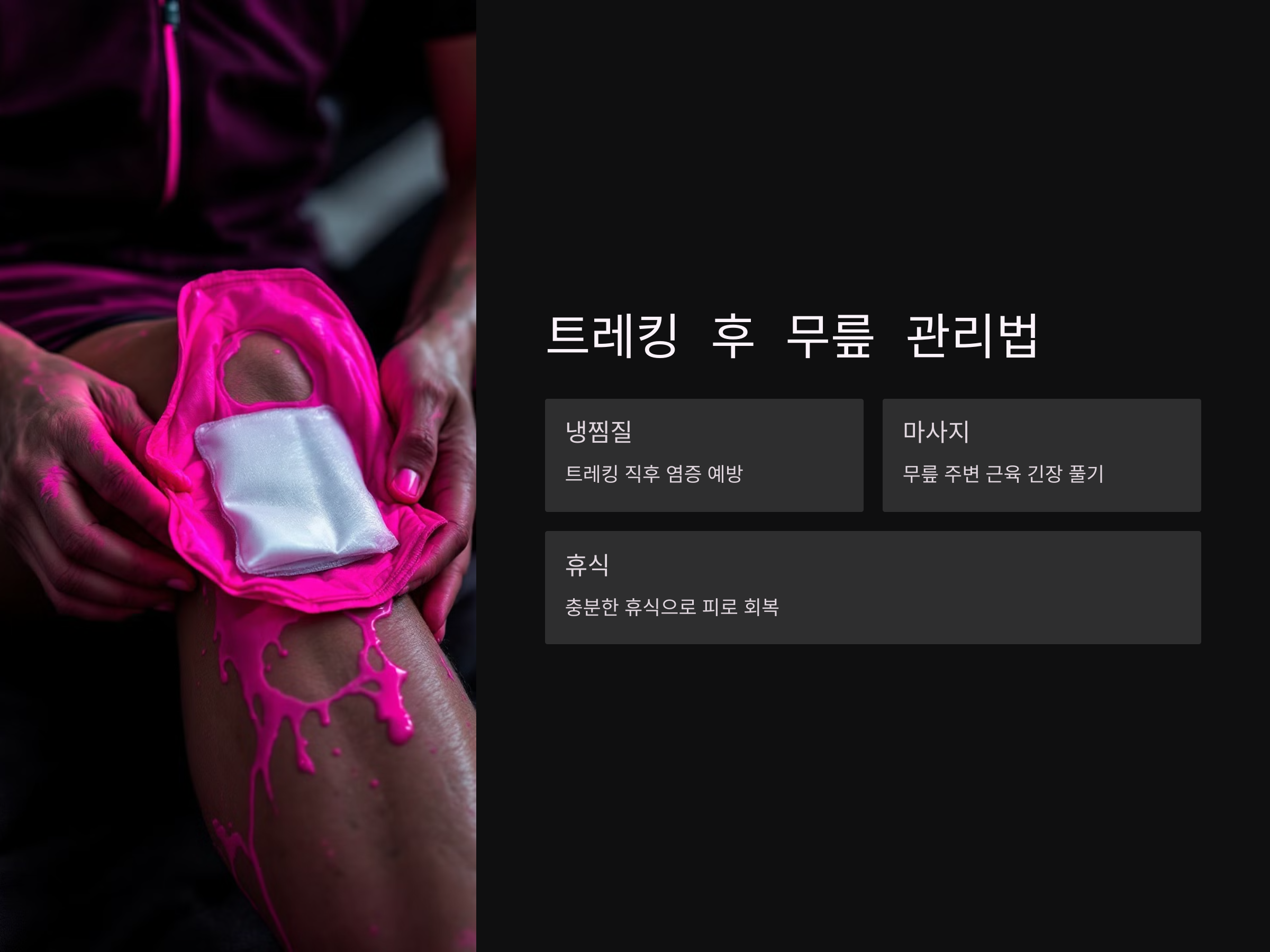- 냉찜질: 트레킹 직후 무릎에 냉찜질을 해 염증을 예방합니다.