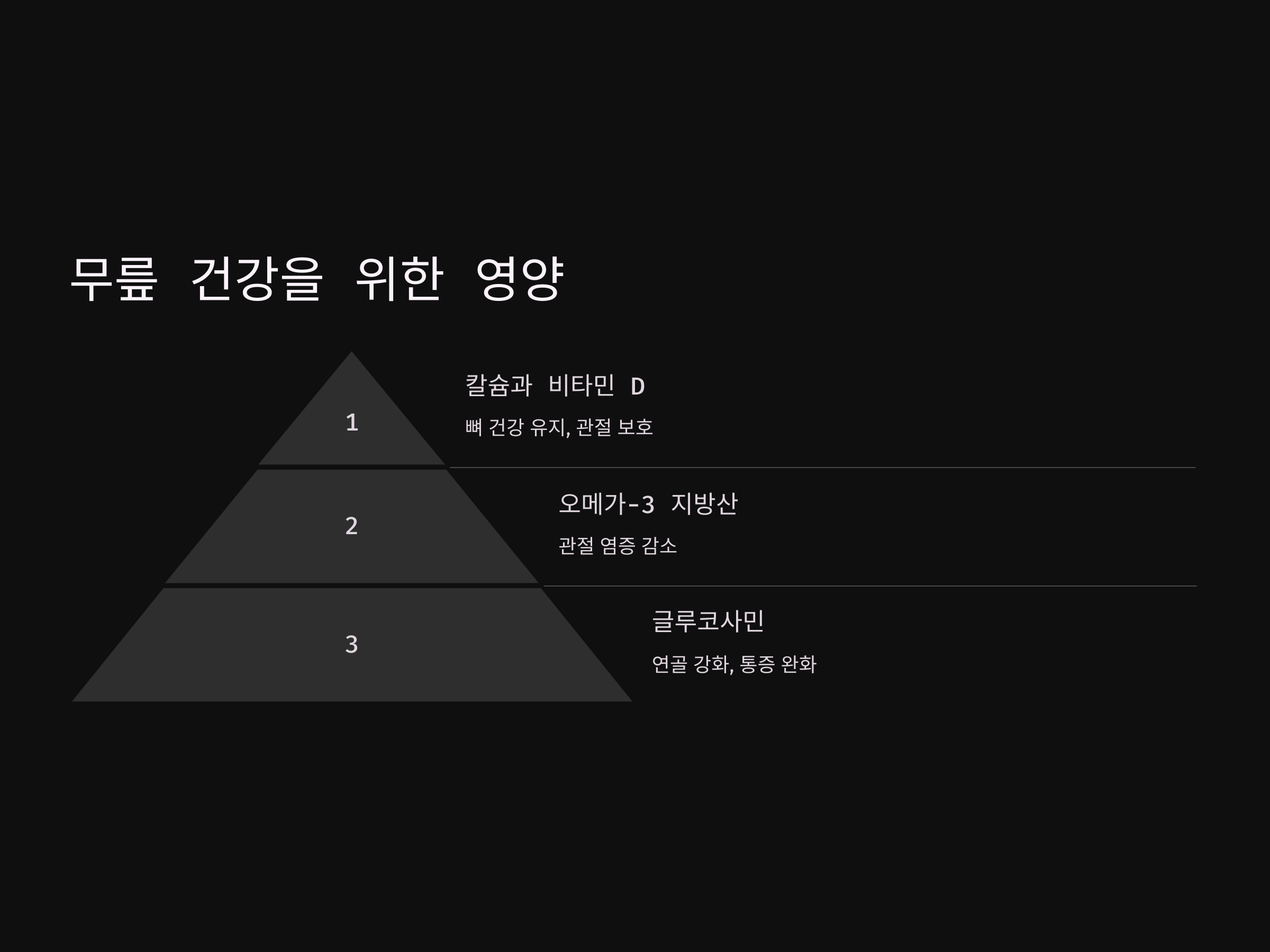 - 칼슘과 비타민 D: 뼈 건강을 유지하며 관절을 보호합니다.