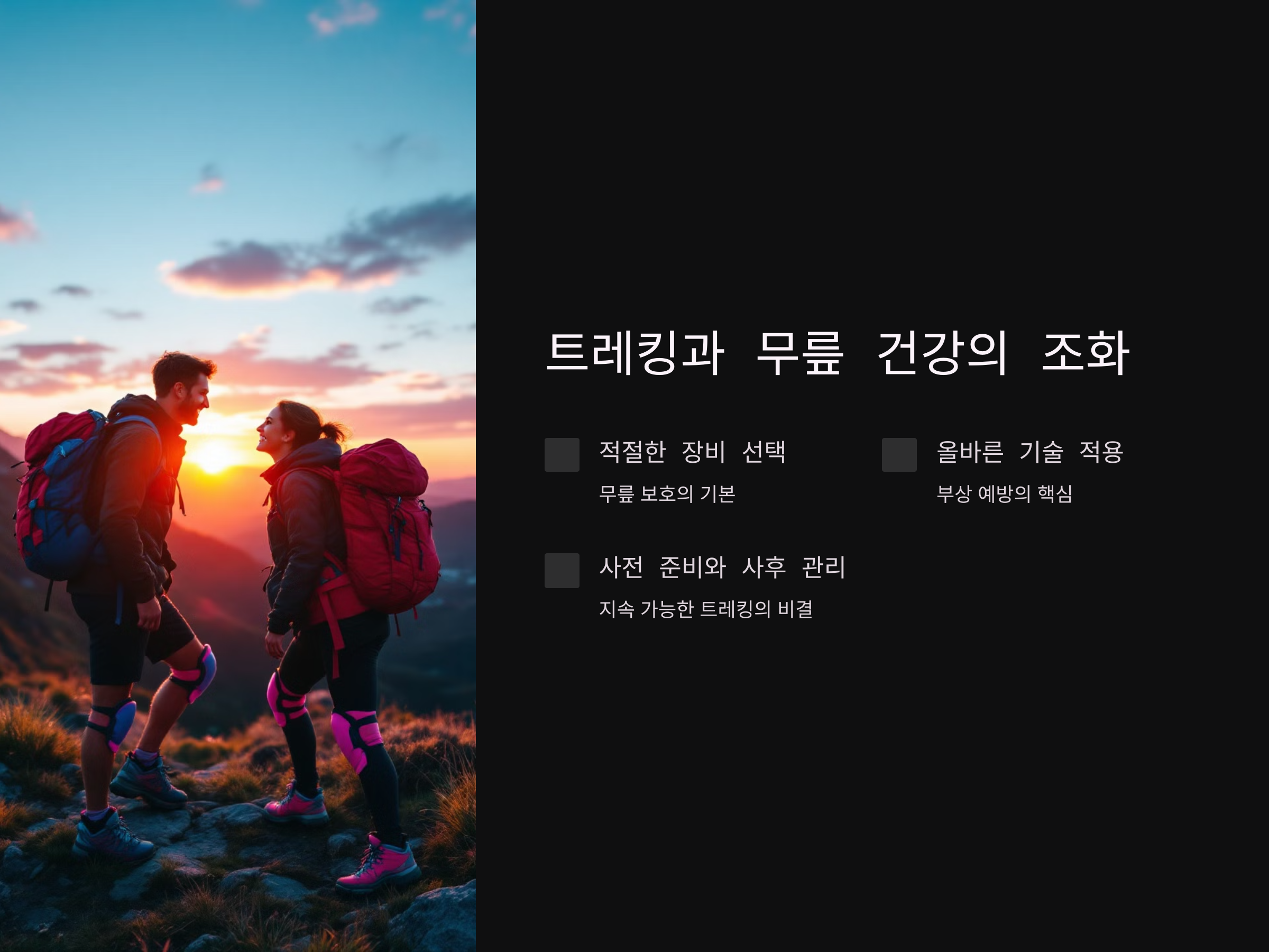 - 적절한 보조 도구 사용: 트레킹 폴, 무릎 보호대 등을 활용해 무릎의 부담을 줄입니다.