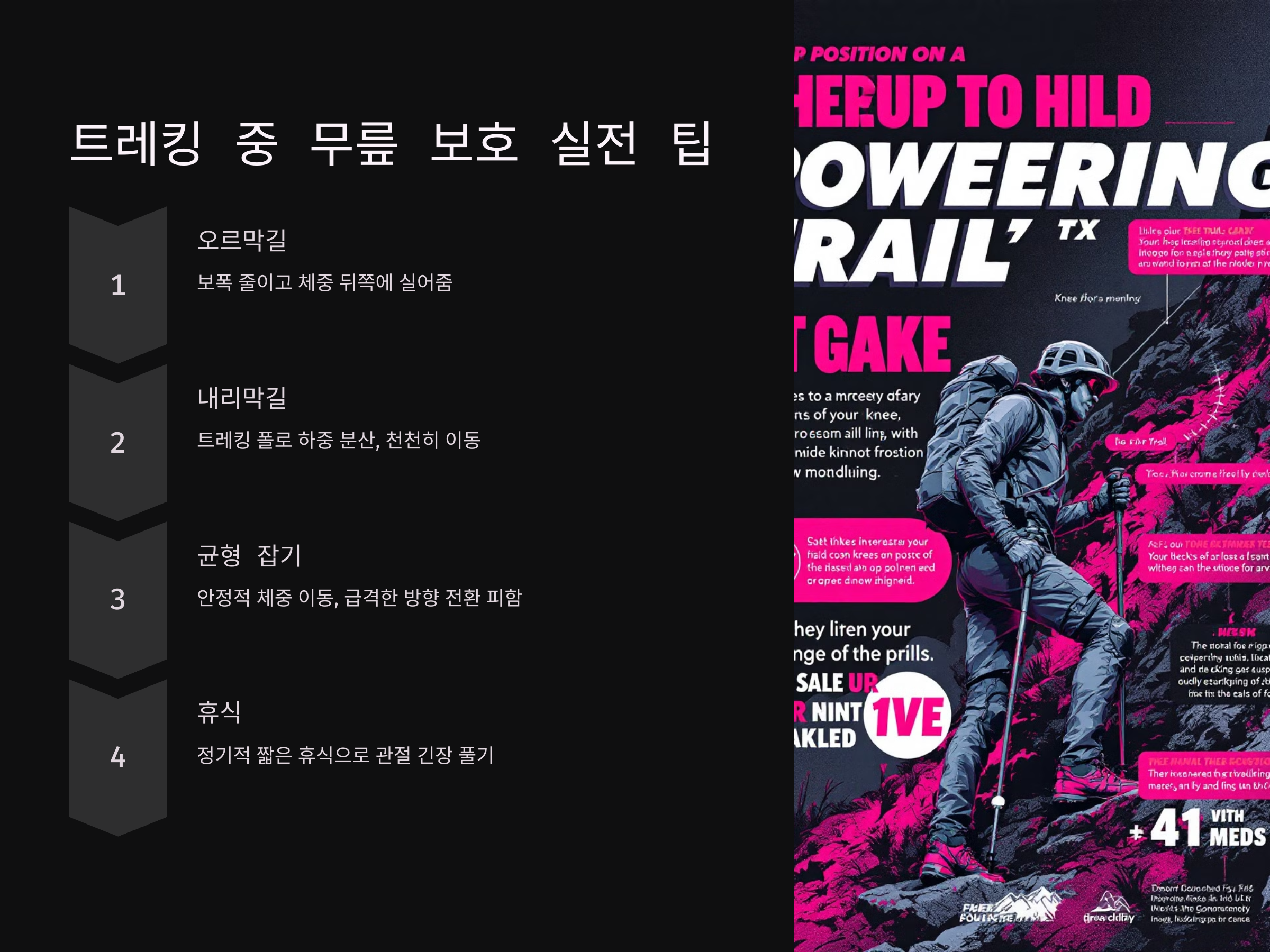 장비를 올바르게 사용하더라도 잘못된 트레킹 습관은 무릎에 부담을 줄 수 있습니다. 다음은 실전에서 적용할 수 있는 유용한 팁입니다.