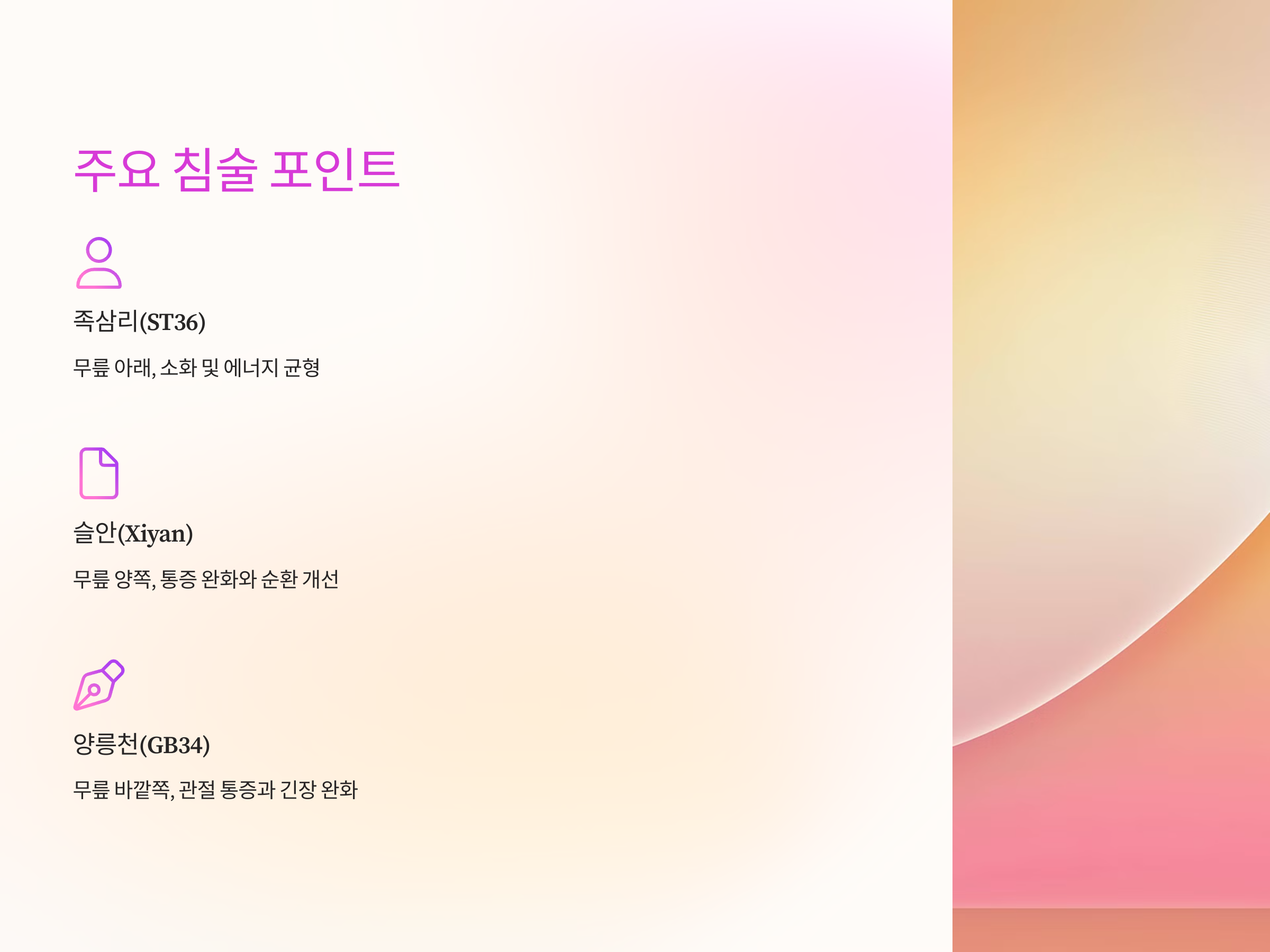 - 슬안(Xiyan): 무릎 양쪽의 오목한 부위로 통증 완화와 순환 개선에 효과적.