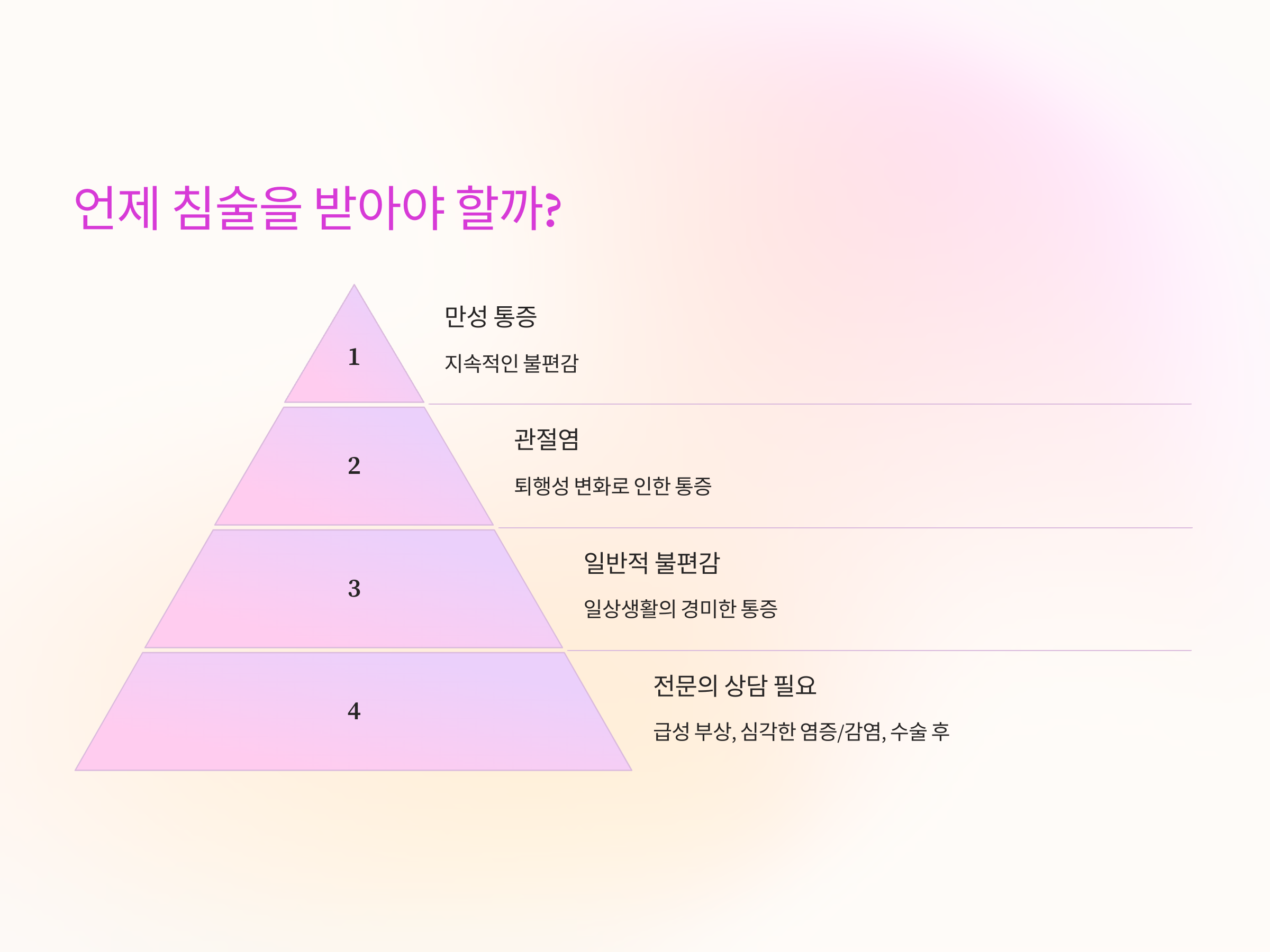 일반적인 통증, 관절염, 또는 만성적인 불편감은 침술로 개선 가능성이 높습니다. 전문가의 평가를 통해 최적의 치료 계획을 세우는 것이 중요합니다.