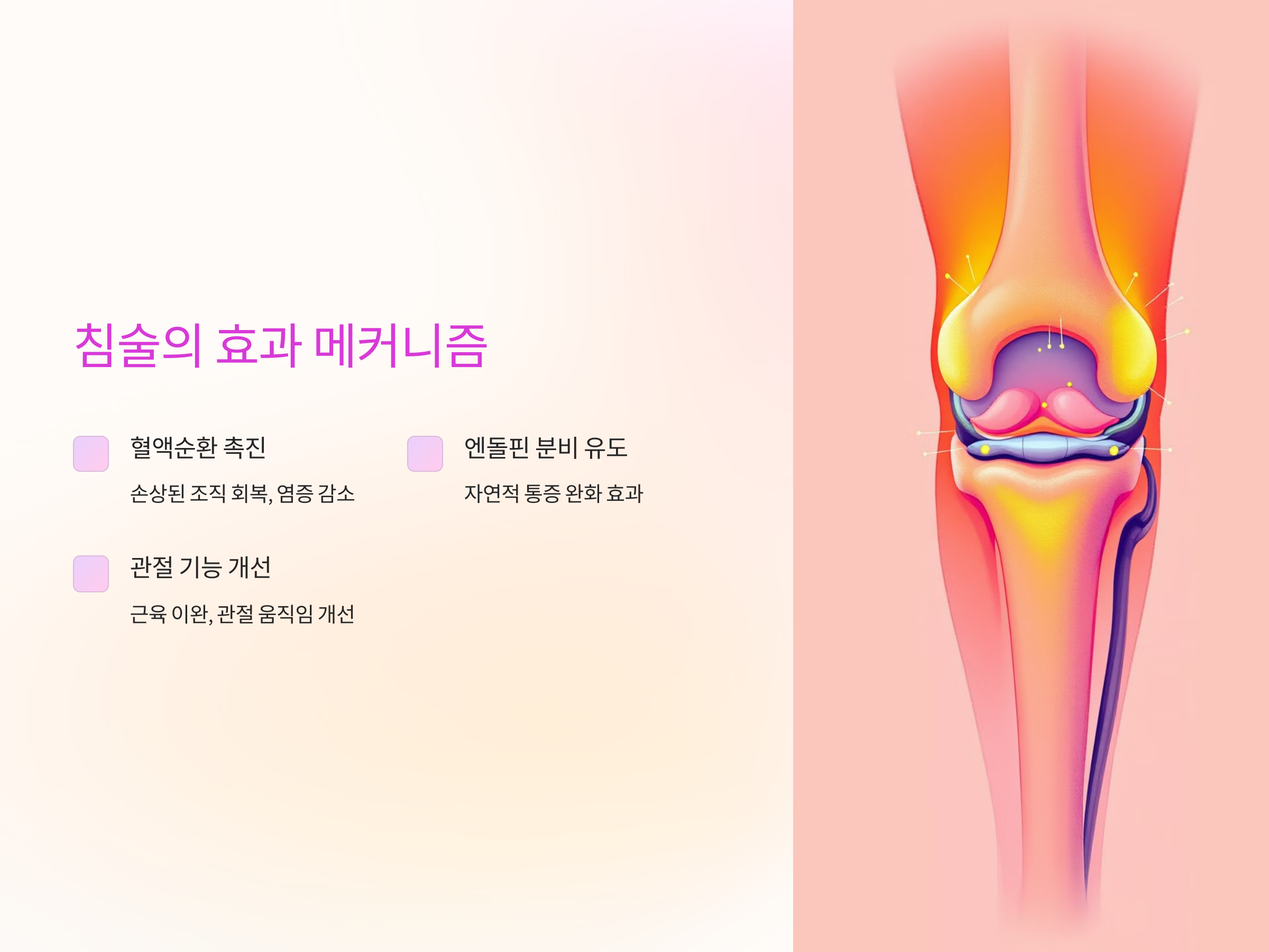- 2018년 메타 분석: 20개 이상의 임상시험을 검토한 결과, 침술은 통증 완화와 기능 향상에 유의미한 효과를 보였습니다. 특히 관절염 환자에게서 긍정적인 결과가 나타났습니다.