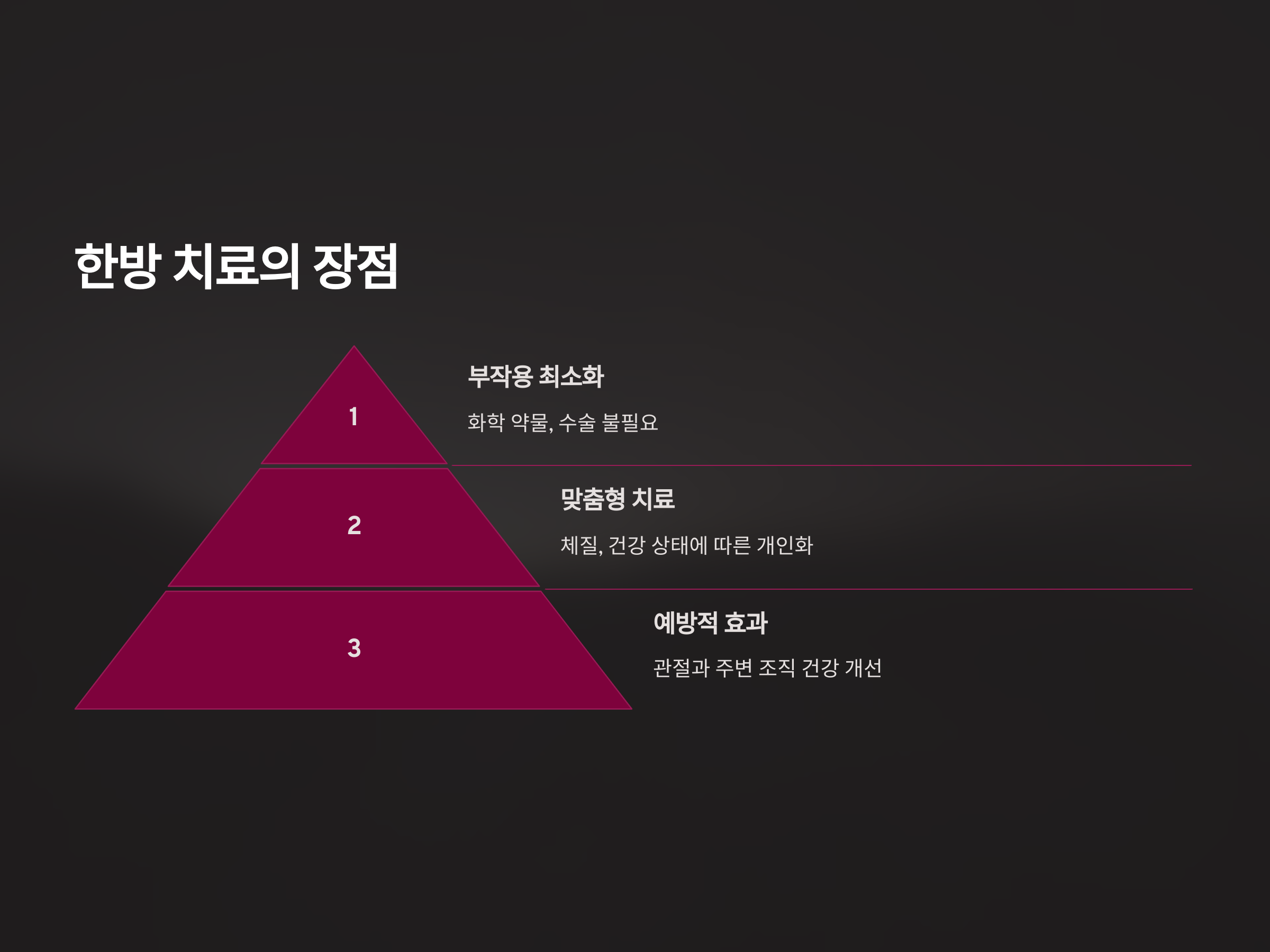 한방 치료는 화학 약물이나 수술을 필요로 하지 않기 때문에 장기적으로 부작용에 대한 부담이 적습니다. 특히 약물에 민감하거나 수술이 어려운 고령자에게 안전한 대안으로 권장됩니다.