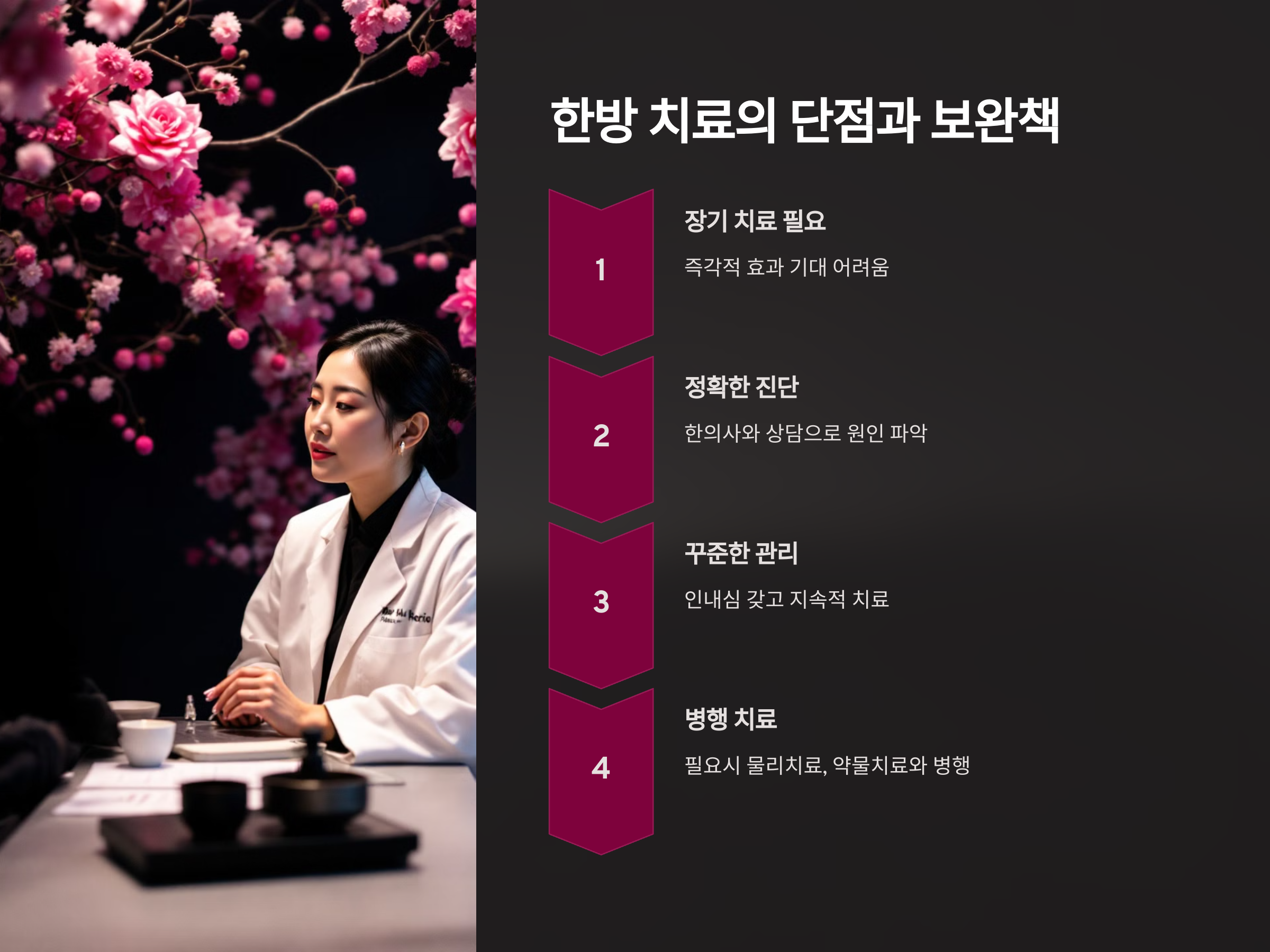 한방 치료는 체질별 맞춤 치료로 효과를 기대할 수 있지만, 치료 기간이 다소 길고 즉각적인 결과를 기대하기 어렵다는 단점이 있습니다. 이를 보완하기 위해 다음을 고려할 수 있습니다.