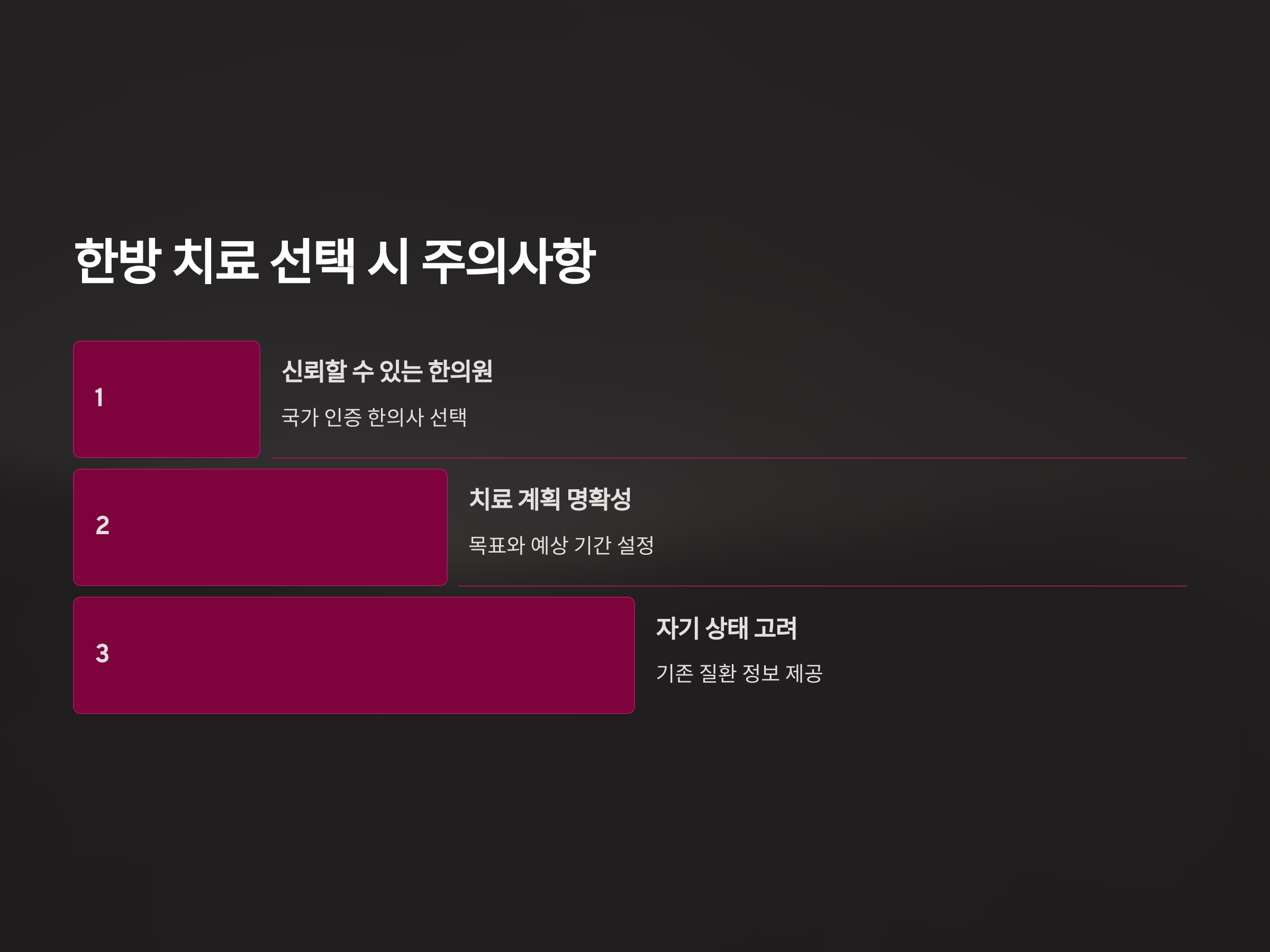 - 치료 계획의 명확성: 치료 목표와 예상 기간을 한의사와 상의하여 명확히 설정.