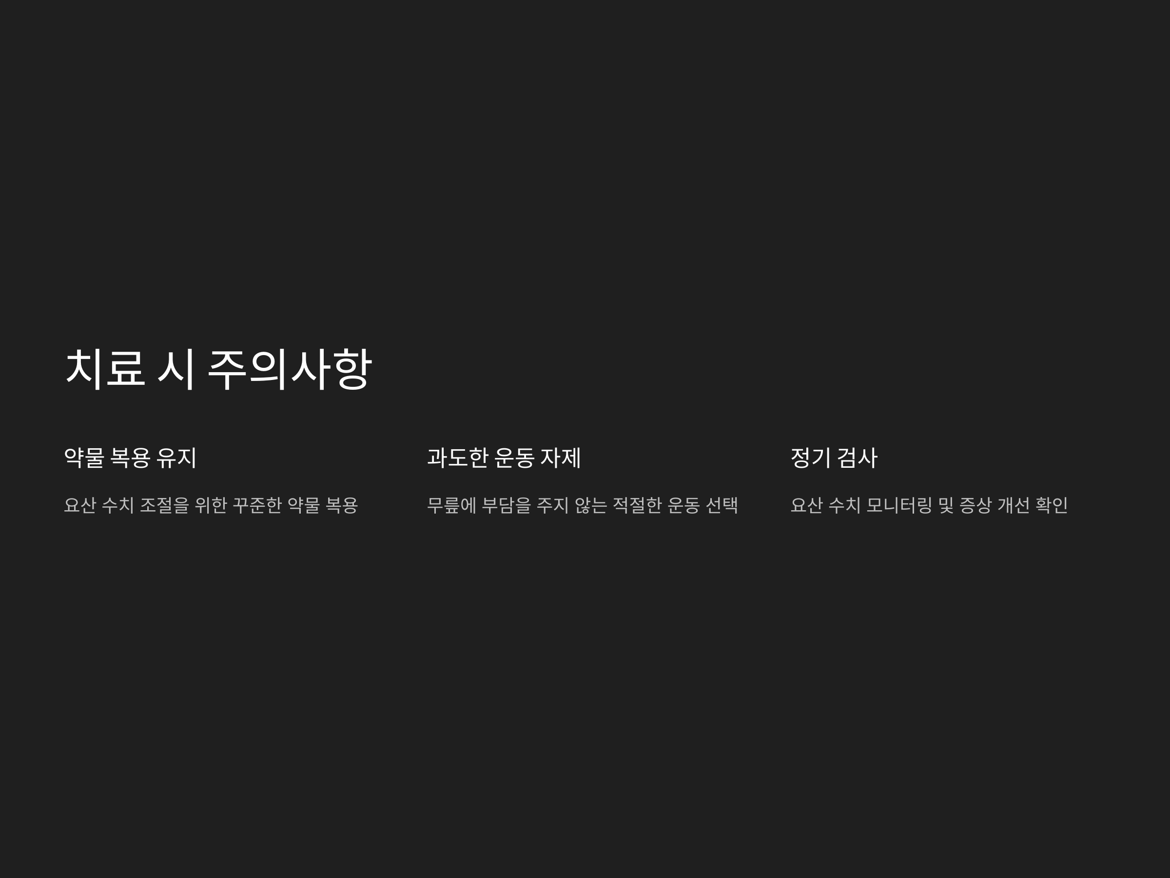 - 약물 복용을 꾸준히: 요산 수치를 낮추는 약물은 꾸준히 복용해야 하며, 의사와 상담 후 약물 조정이 필요할 수 있습니다.