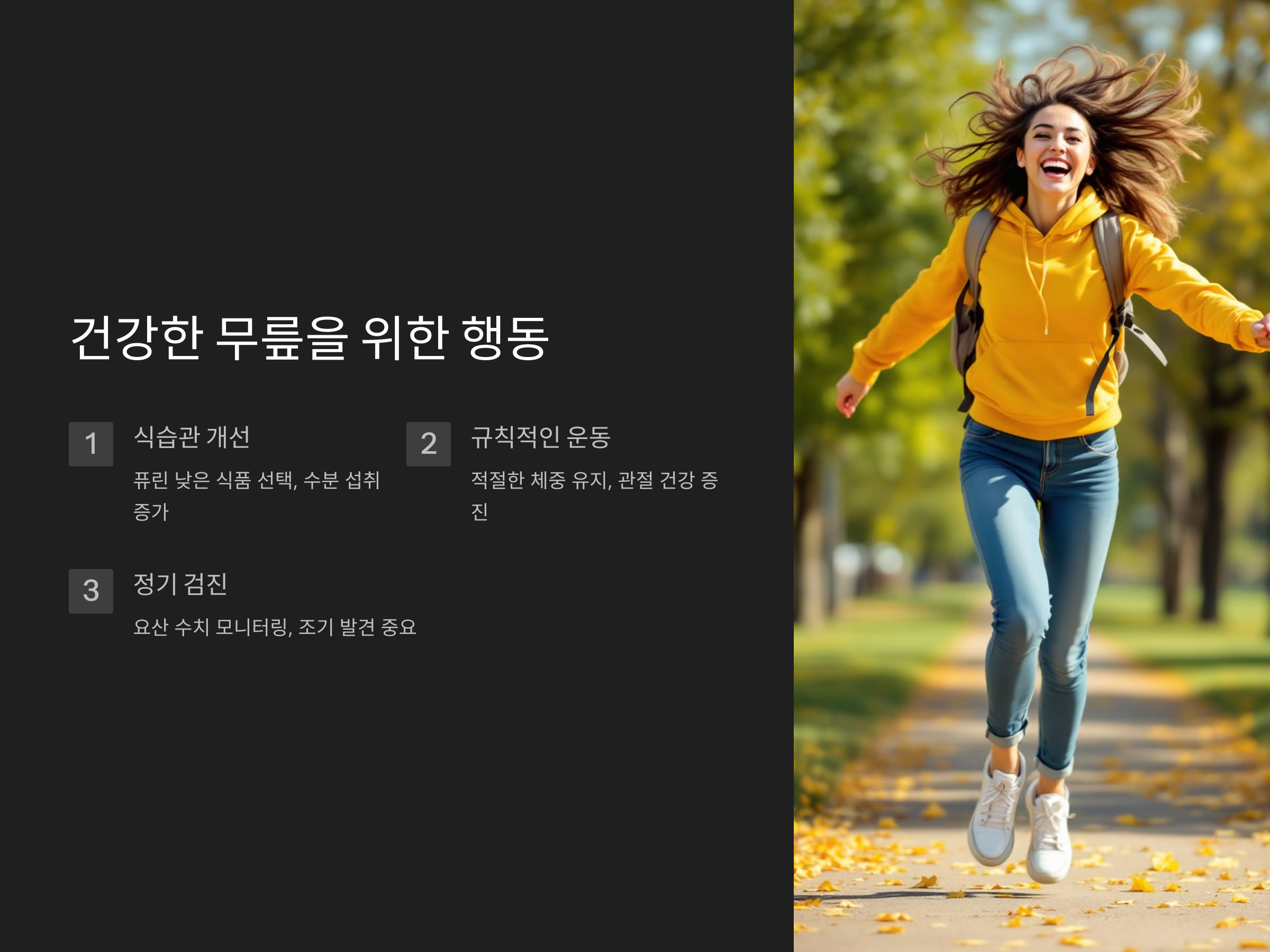무릎 통풍은 예방할 수 있습니다. 올바른 관리와 생활습관으로 건강한 무릎을 지키세요!