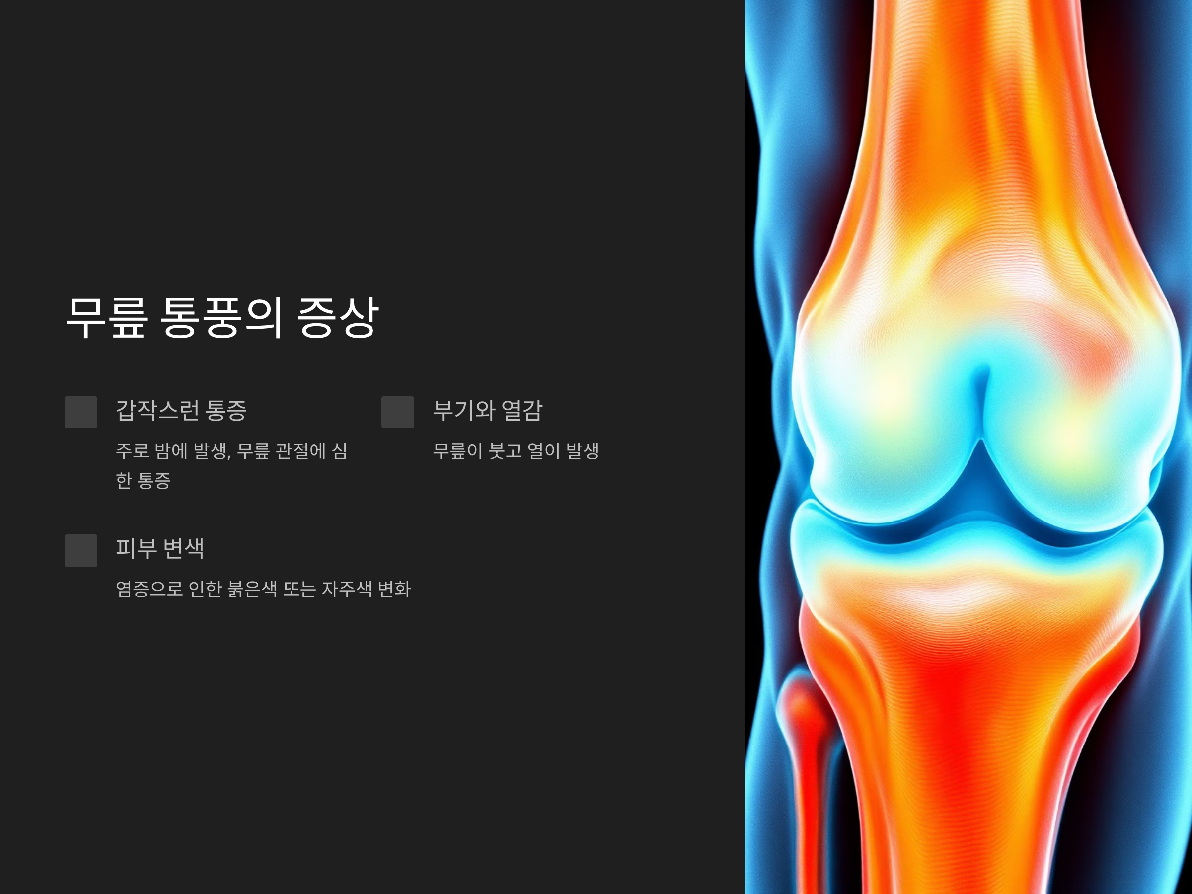 - 갑작스런 통증: 주로 밤에 발생하며, 무릎 관절에 심한 통증이 나타납니다.
