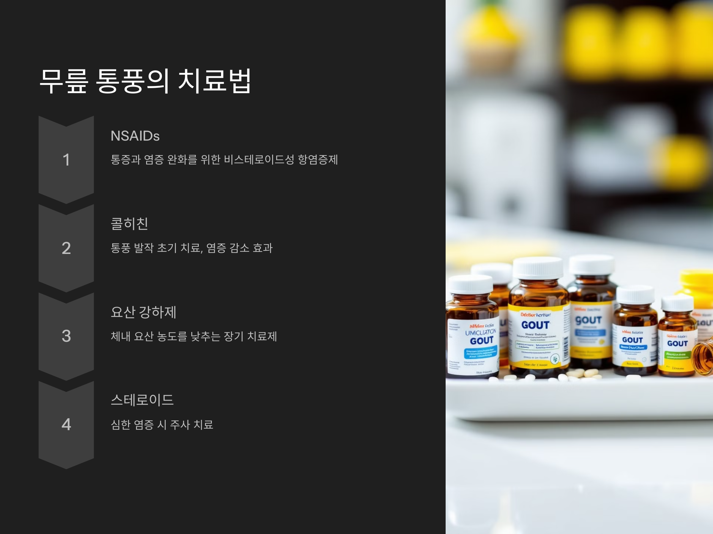 - 요산 강하제: 체내 요산 농도를 낮추는 약물로, 장기적인 치료에 사용됩니다.