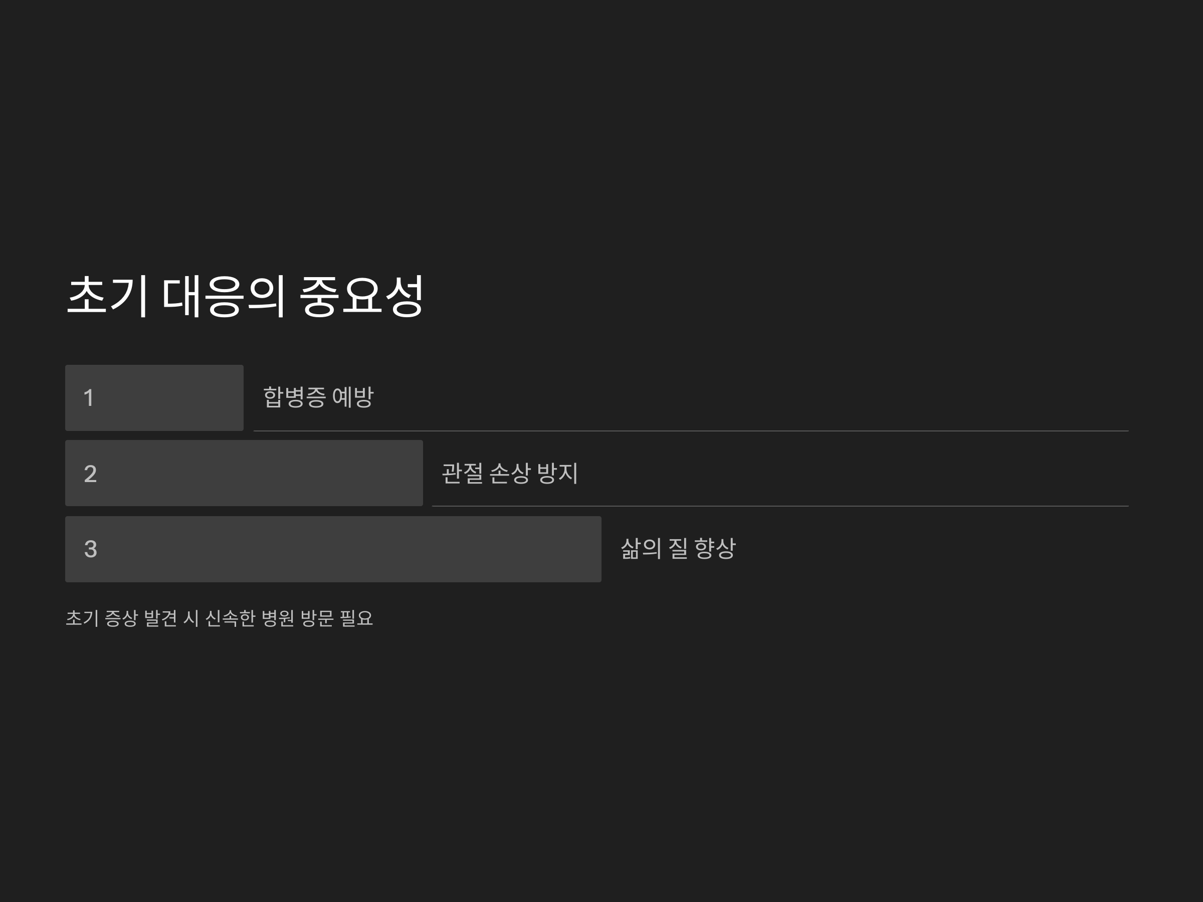 무릎 통풍은 초기 관리만 잘 하면 충분히 예방할 수 있는 질환입니다. 올바른 식습관과 생활습관을 유지하고, 초기 증상을 주의 깊게 살펴보세요. 건강한 무릎을 위해 지금부터라도 통풍 예방에 힘써야 합니다!