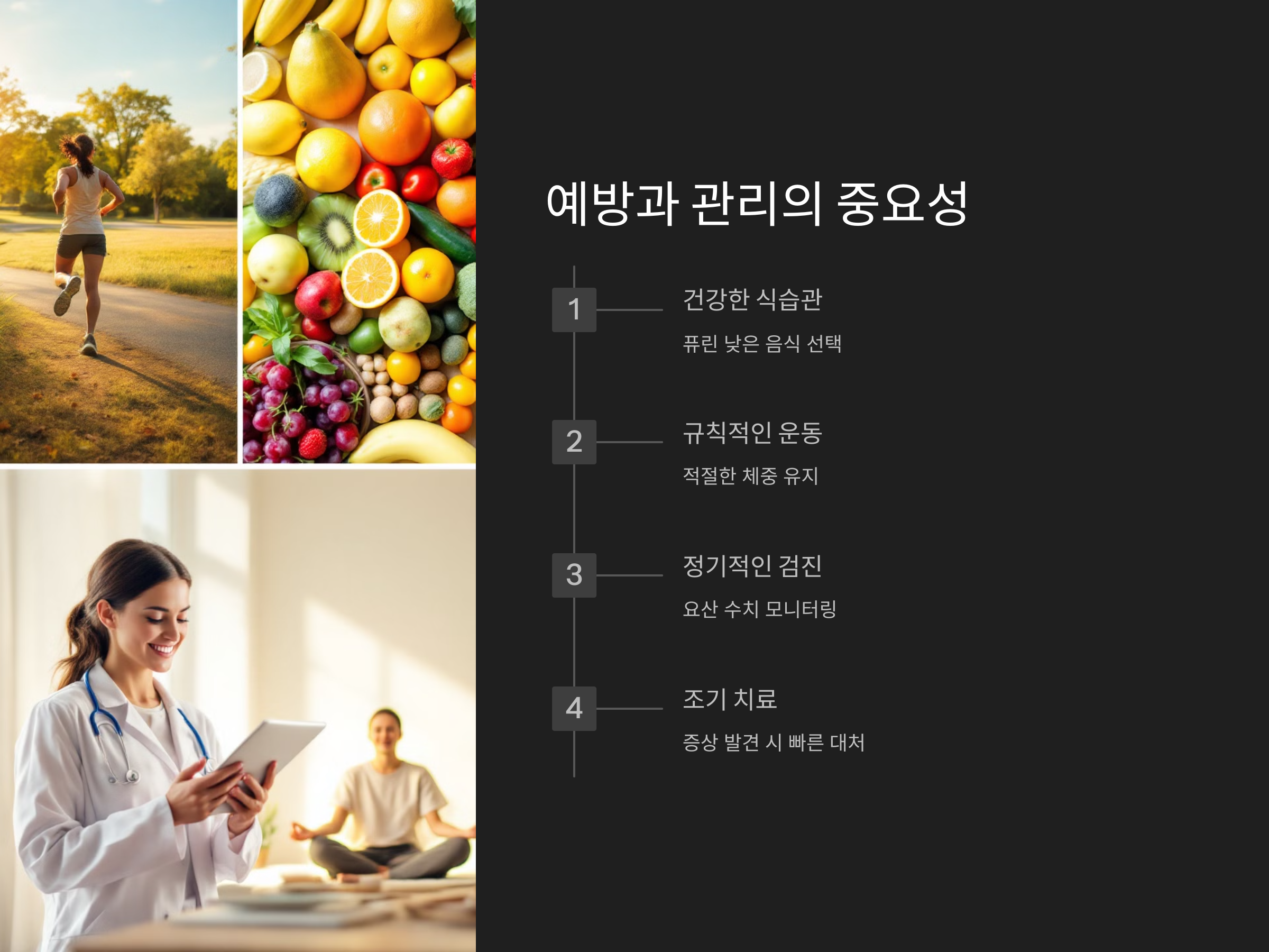 퓨린이 많은 고기나 해산물, 술을 피하고, 채소와 과일을 중심으로 균형 잡힌 식사를 하는 것이 중요합니다.