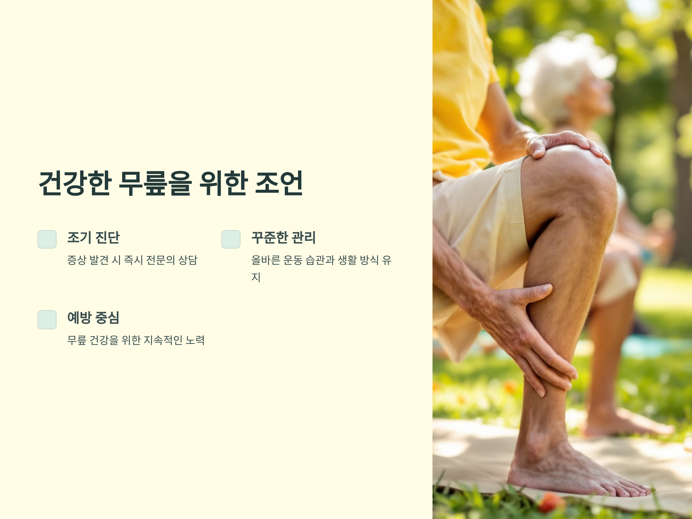 - 적절한 체중 유지: 과체중은 무릎에 부담을 주기 때문에, 체중을 적절히 관리하는 것이 중요합니다.