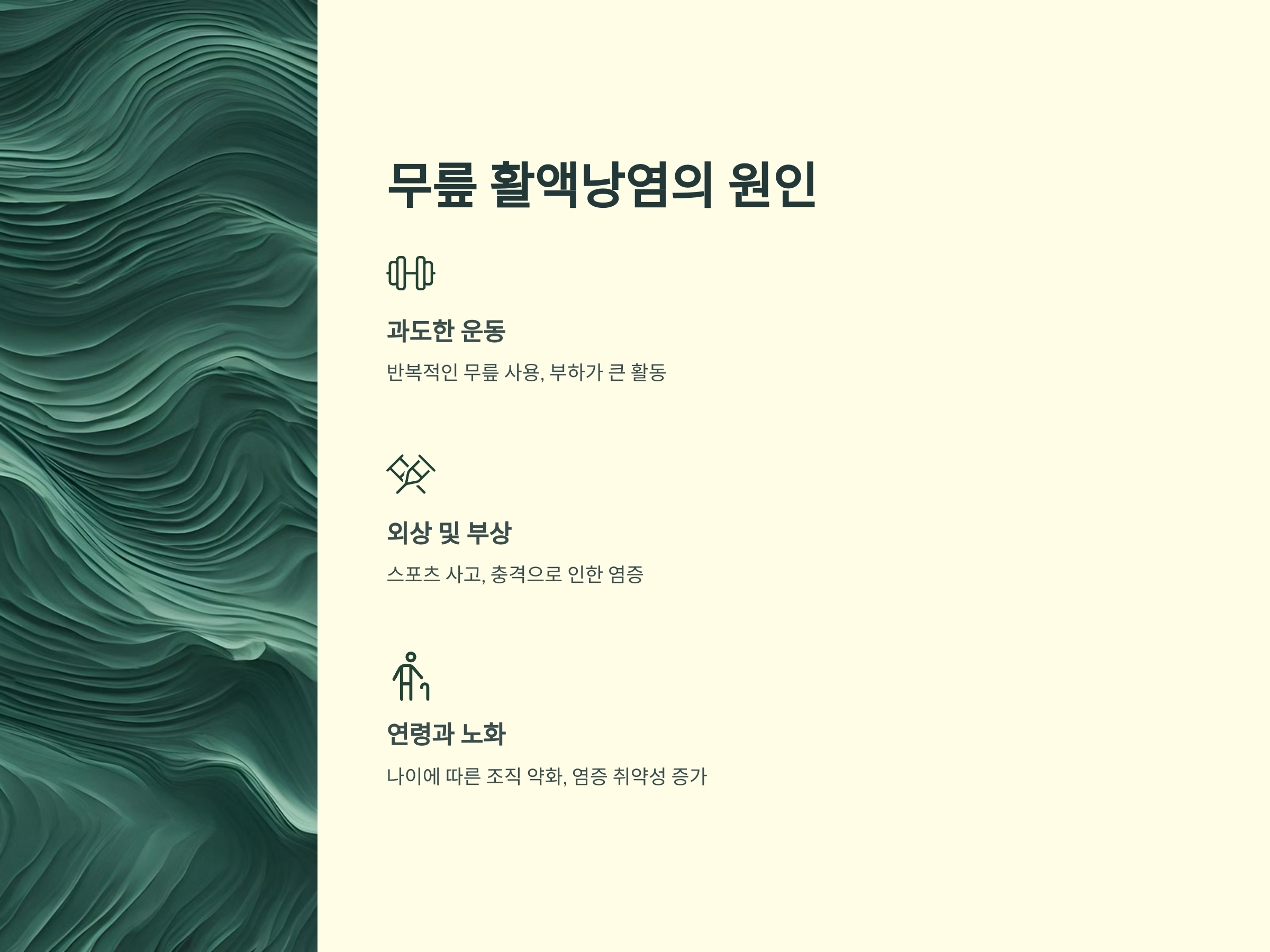 - 연령과 노화: 나이가 들수록 무릎 주변의 조직이 약해지고 염증에 더 취약해지므로 활액낭염이 발생할 가능성이 높습니다.