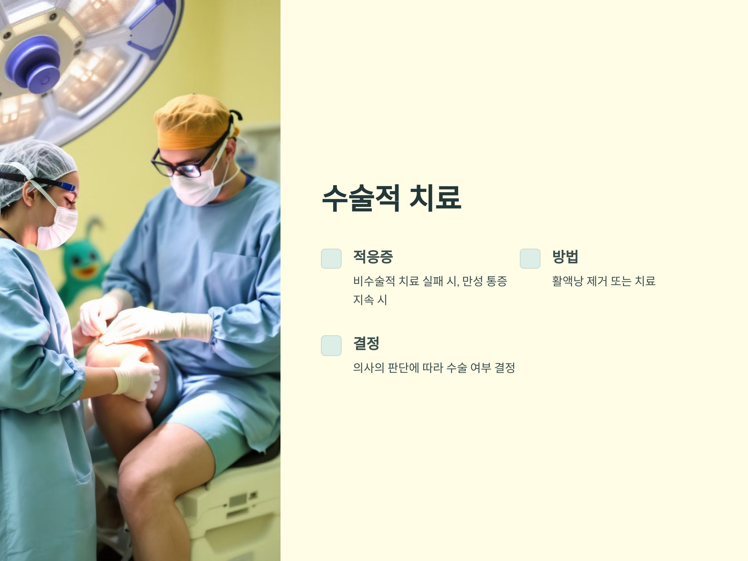 대부분의 경우 비수술적 방법으로 무릎 활액낭염을 치료할 수 있지만, 만약 통증이 계속되거나 염증이 심해져 기능을 제한하는 경우, 수술이 필요할 수 있습니다. 수술은 일반적으로 활액낭을 제거하거나 치료하는 방식으로 진행되며, 이는 의사의 판단에 따라 결정됩니다.