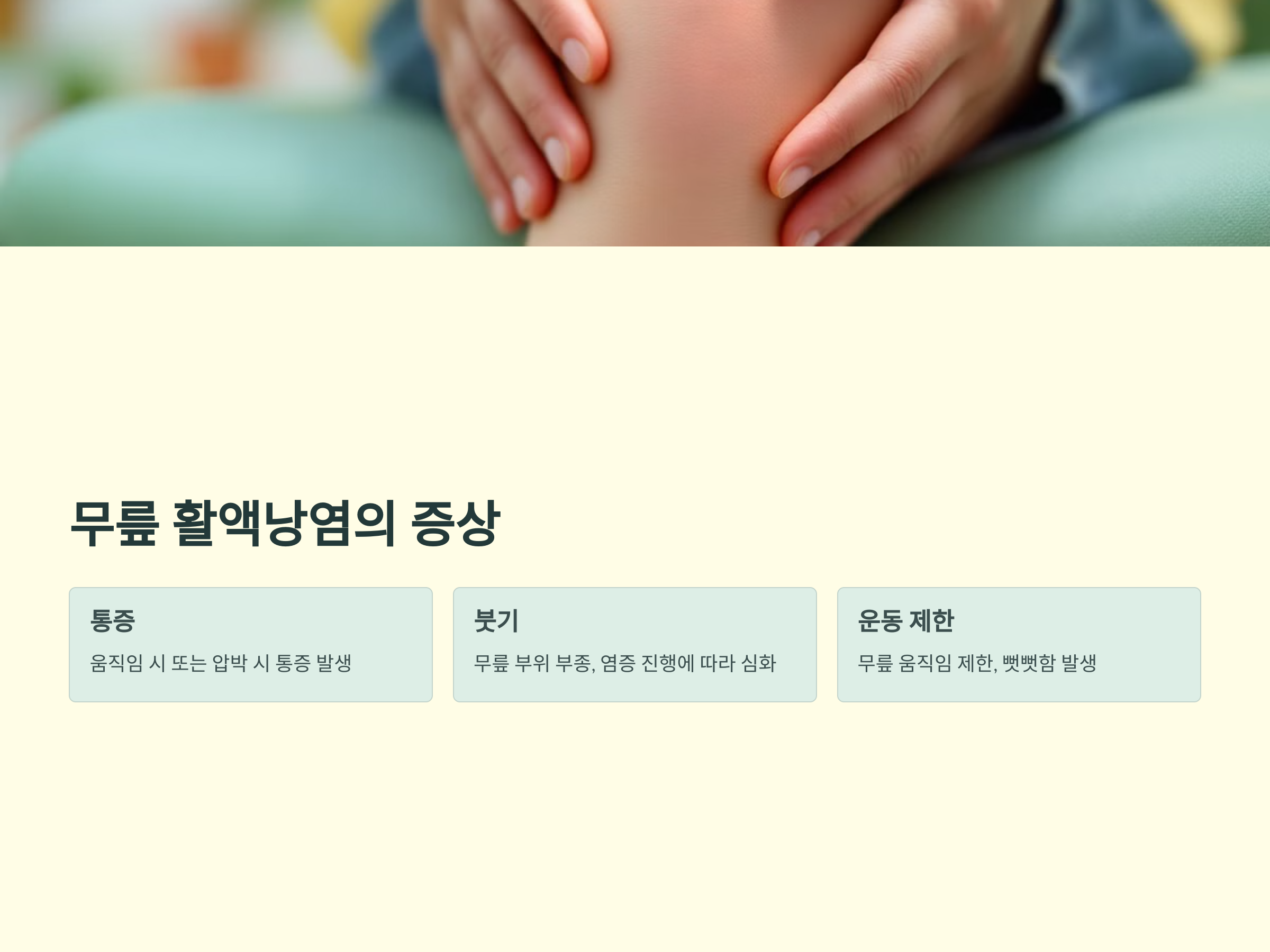 활액낭염의 주요 증상은 관절의 붓기, 통증, 열감 등이며, 이를 무시하고 방치하면 만성적인 문제로 발전할 수 있습니다. 특히 무릎은 자주 사용되는 부위이기 때문에 활액낭염의 증상이 나타날 경우 일상생활에 큰 영향을 미칠 수 있습니다. 이 질환은 급성기에는 증상이 갑자기 나타나며, 만성으로 진행되면 통증이 지속적이고 점차 심해질 수 있습니다.