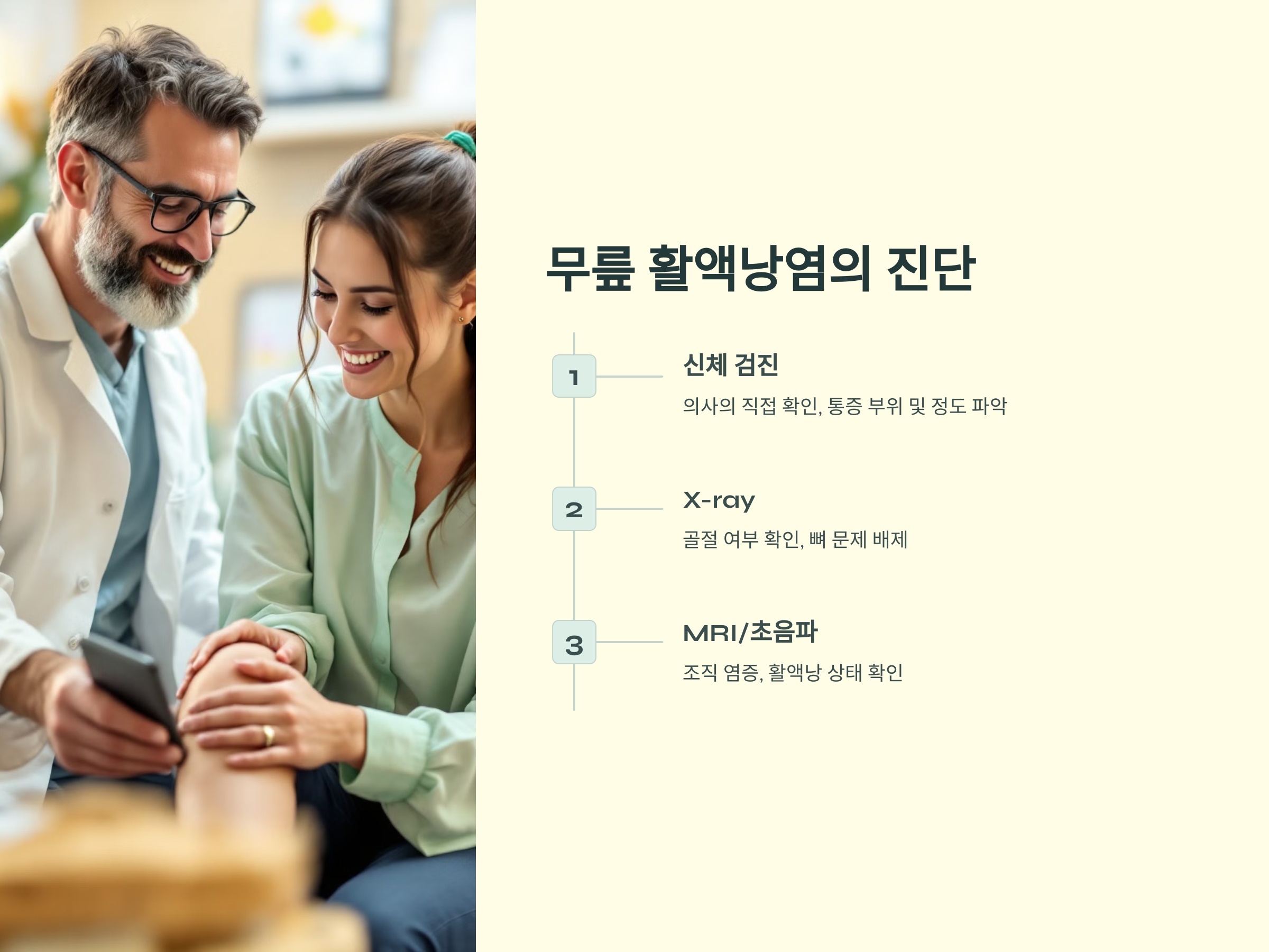 무릎 활액낭염을 정확히 진단하기 위해서는 몇 가지 방법을 사용합니다. 첫 번째 단계는 의사의 신체 검진입니다. 의사는 무릎의 붓기, 통증 정도 등을 확인하고, 어떤 움직임에서 통증이 발생하는지 물어봅니다. 그 후, 영상 검사를 통해 정확한 상태를 파악합니다: