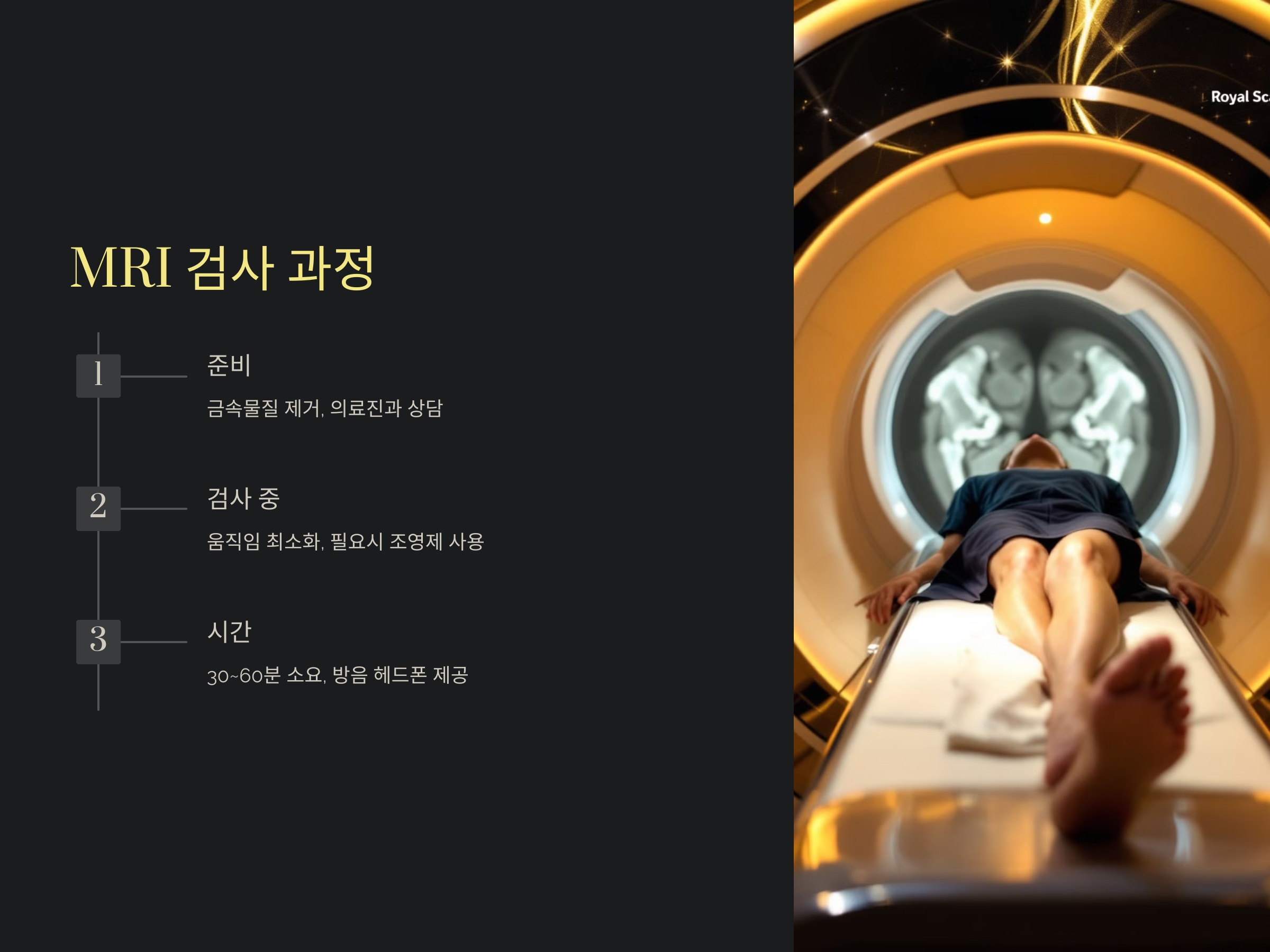 검사 시간은 보통 30~60분이며, 과정 중 불편함을 줄이기 위해 방음 헤드폰이나 음악을 제공하기도 합니다.