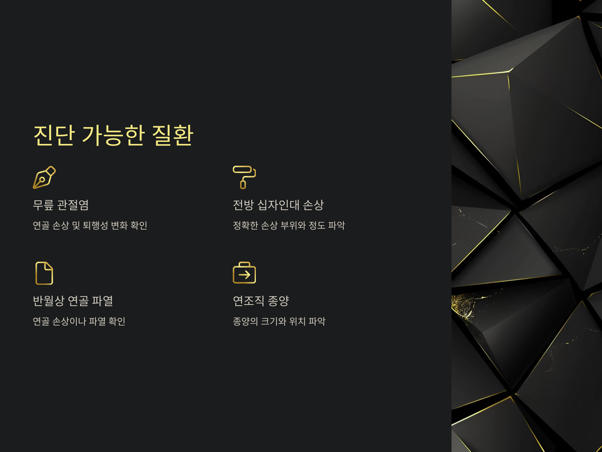 - 무릎 관절염: 관절 연골의 손상 및 퇴행성 변화 확인.