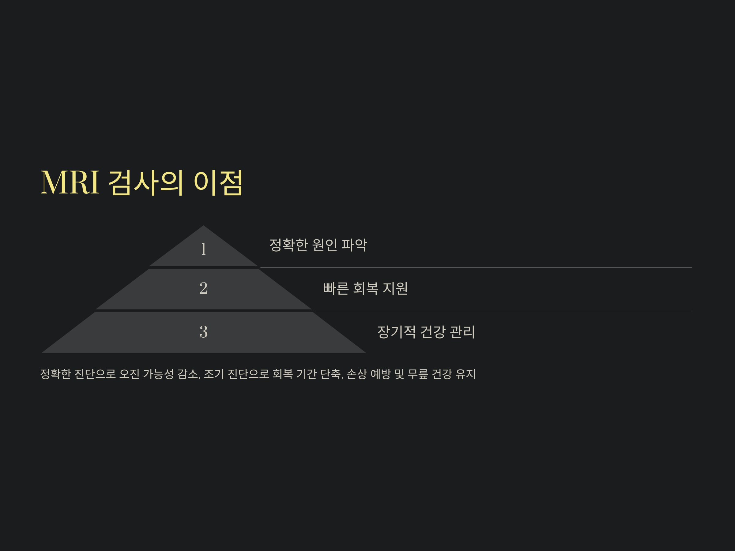 MRI 검사는 정확한 진단으로 치료와 회복을 돕는 중요한 도구입니다. 이를 통해 다음과 같은 이점을 얻을 수 있습니다.