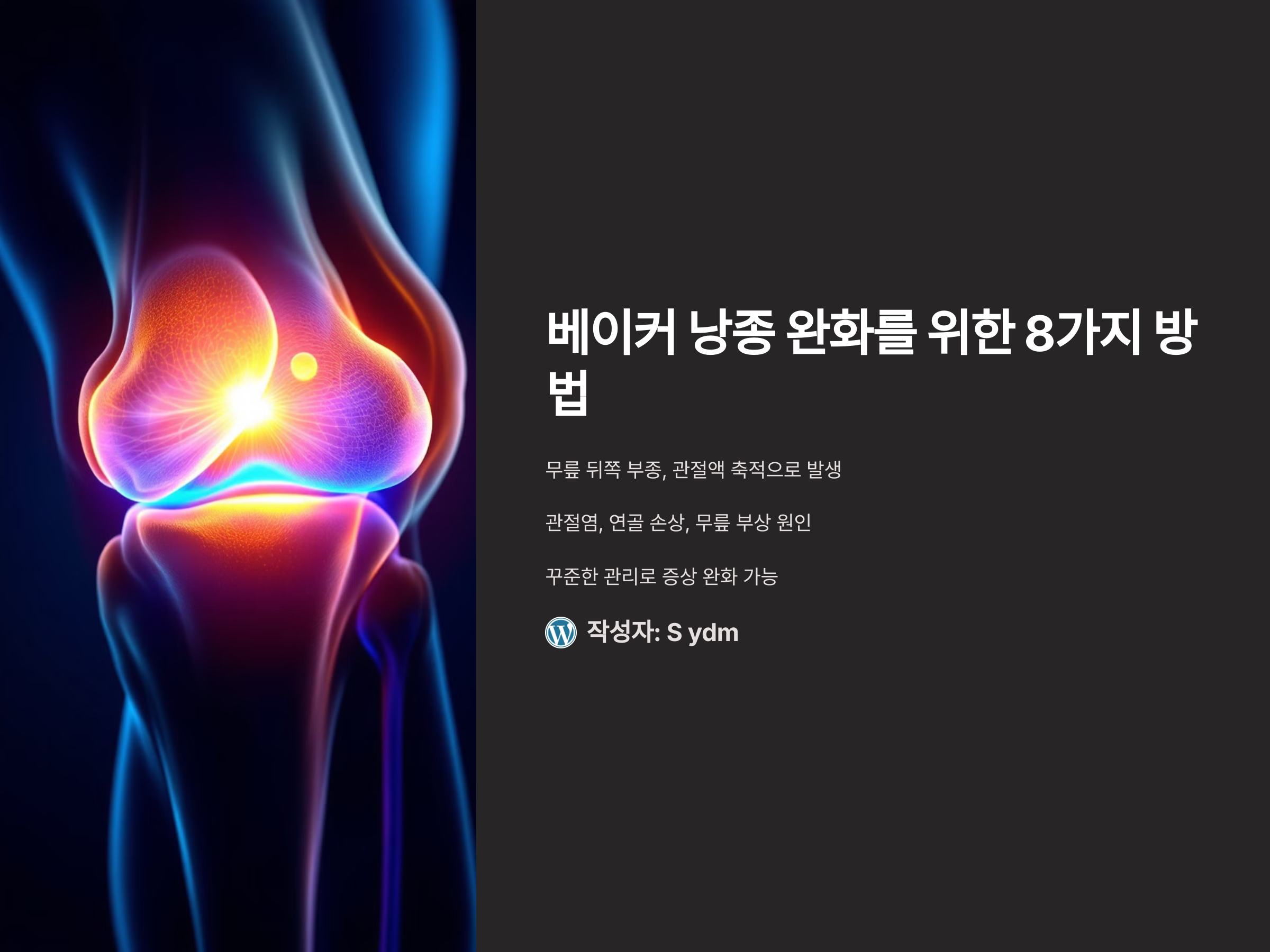 베이커 낭종은 무릎 뒤쪽에 생기는 부종으로, 관절액이 과도하게 축적되면서 발생합니다. 이는 주로 관절염, 연골 손상, 또는 무릎 부상 등으로 인해 나타납니다. 방치하면 낭종이 커지거나 터질 위험이 있으며, 무릎의 유연성과 안정성을 악화시킬 수 있습니다. 하지만 꾸준한 관리와 치료로 증상을 완화하고 일상생활로 복귀할 수 있습니다. 이번 글에서는 베이커 낭종의 완화 방법 8가지를 구체적으로 다룹니다.