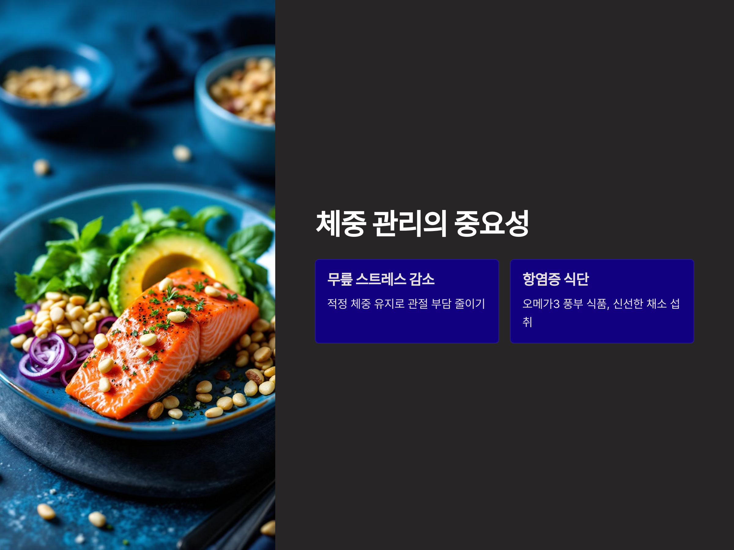과체중은 무릎 관절에 추가적인 스트레스를 가해 베이커 낭종을 악화시킬 수 있습니다. 건강한 식단과 규칙적인 운동을 통해 적정 체중을 유지하세요. 특히 항염증 식단을 활용하면 염증 완화에 더욱 효과적입니다.