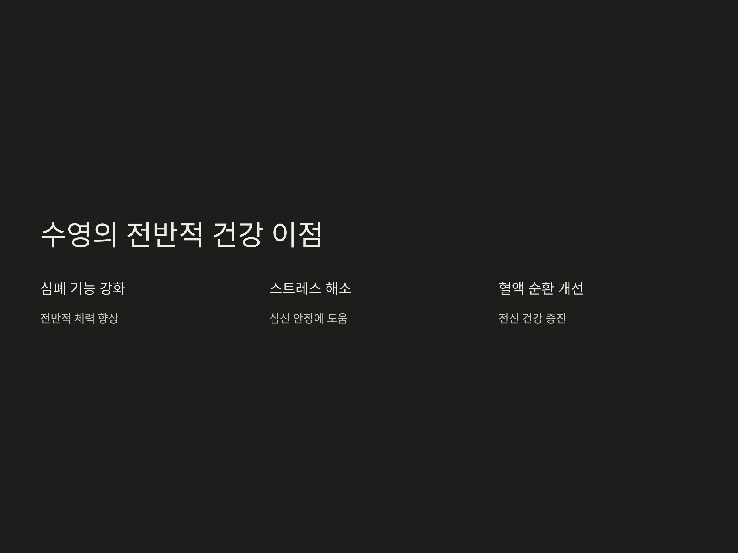 - 혈액 순환 개선: 수영은 혈류를 촉진하여 전신 건강을 개선합니다.