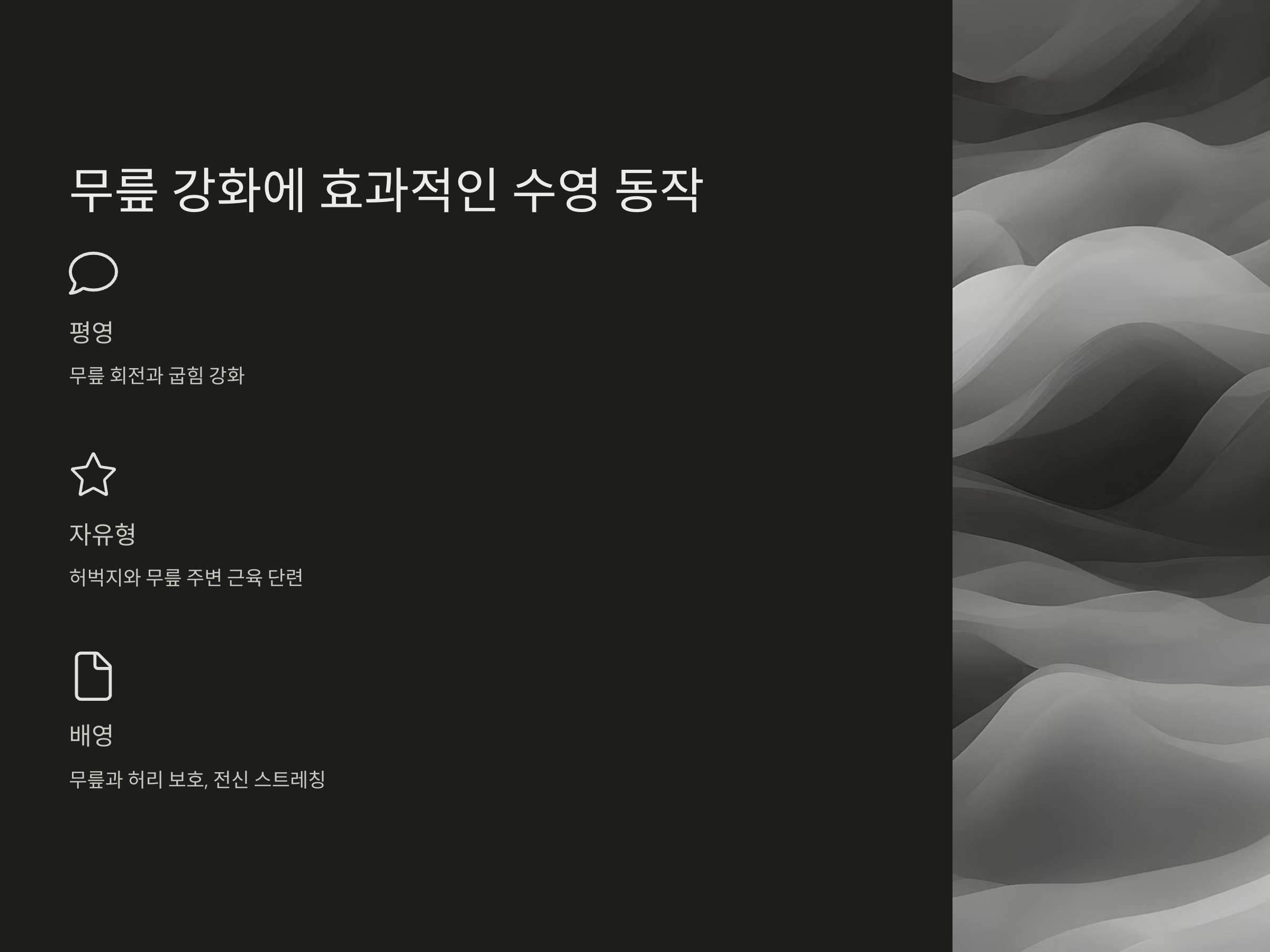 수영의 다양한 동작은 무릎 주변 근육과 인대를 강화하는 데 도움을 줍니다. 대표적인 동작과 그 효과는 다음과 같습니다: