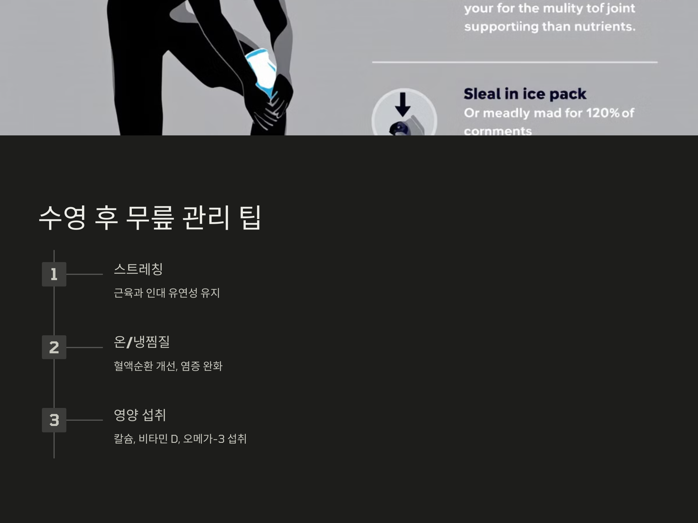 수영 후 무릎을 관리하면 더욱 큰 효과를 누릴 수 있습니다. 다음은 수영 후 무릎을 보호하고 건강을 유지하는 데 도움이 되는 팁입니다: