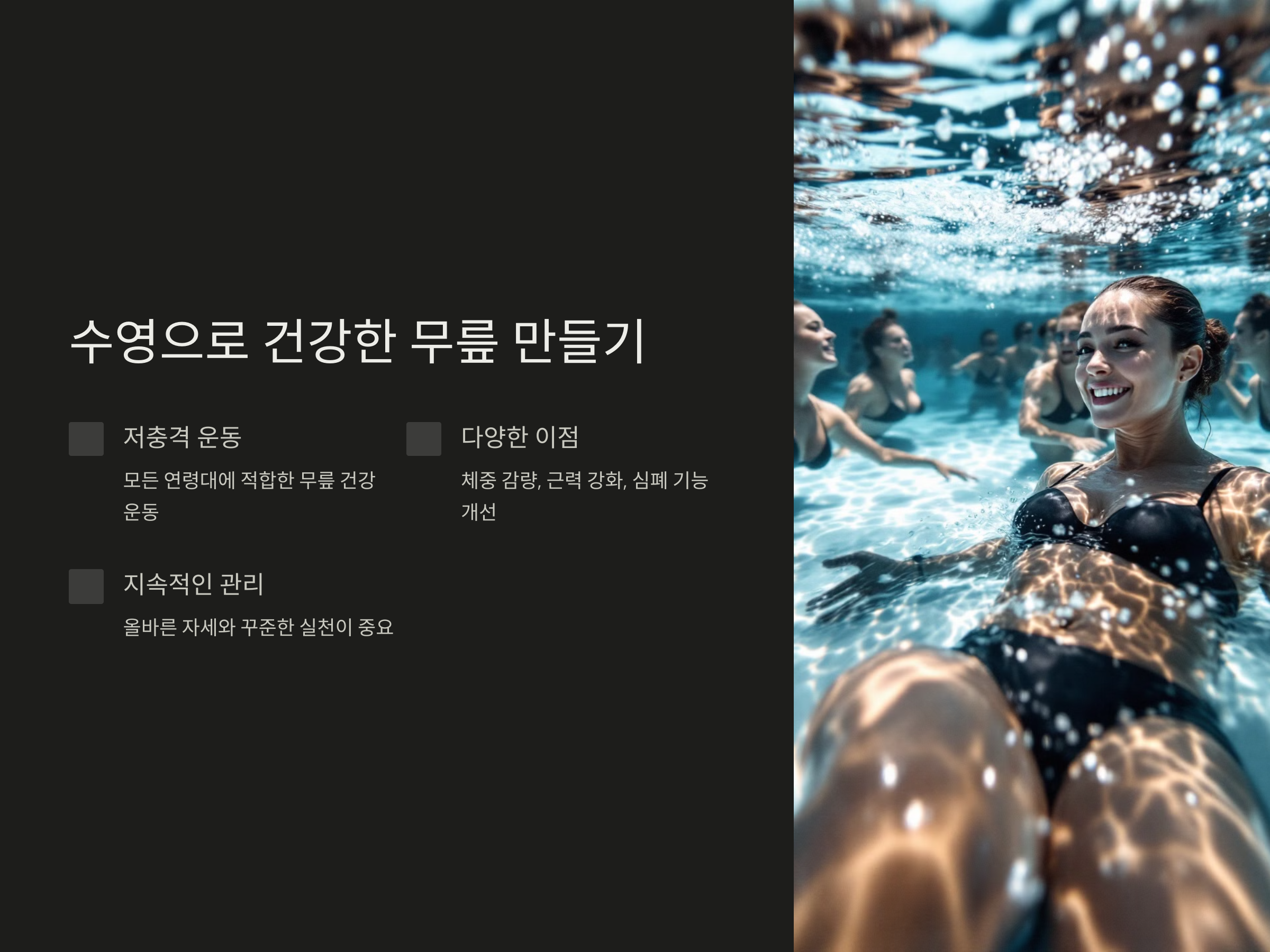 수영은 누구나 접근 가능한 운동으로, 무릎뿐만 아니라 전신 건강을 도모하는 데 이상적인 활동입니다.