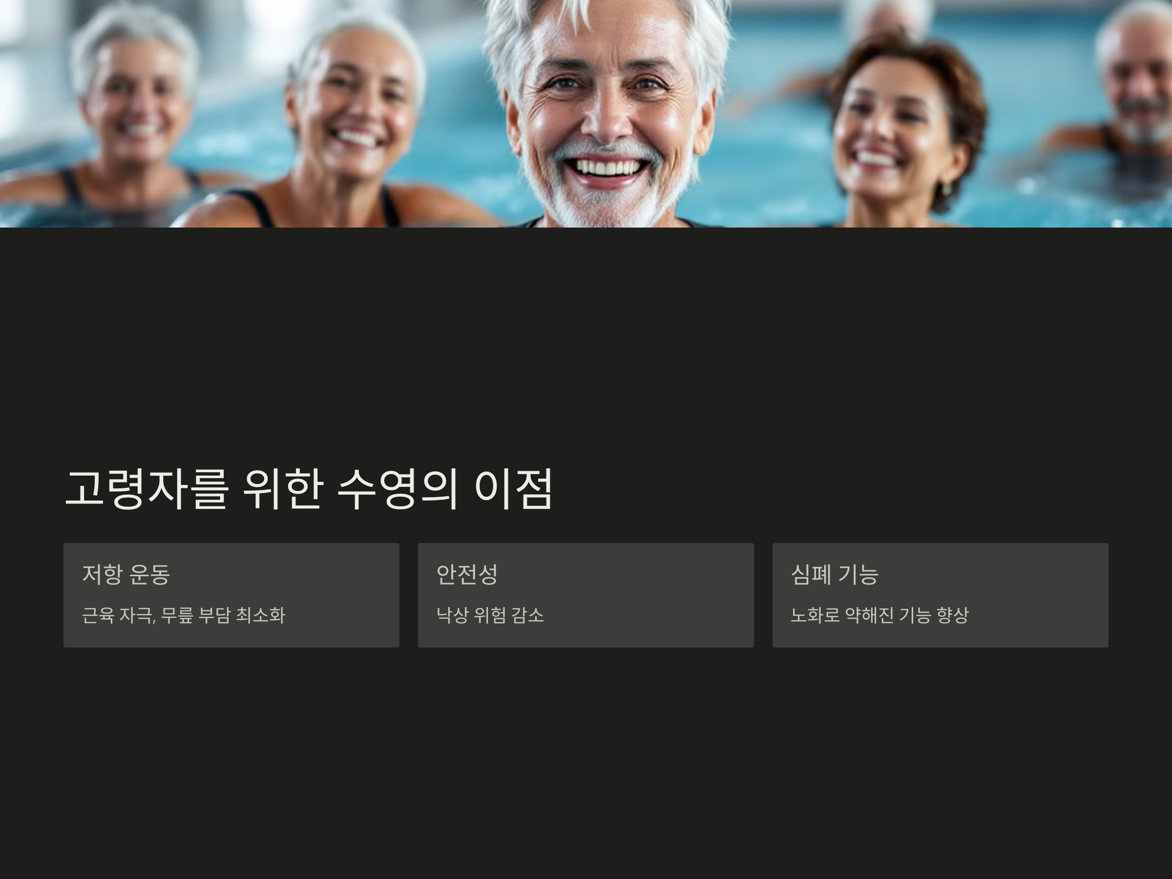 고령자들은 무릎 관절이 약해지기 쉬운데, 수영은 고령자의 체력과 관절 건강을 유지하는 데 적합한 운동으로 손꼽힙니다.