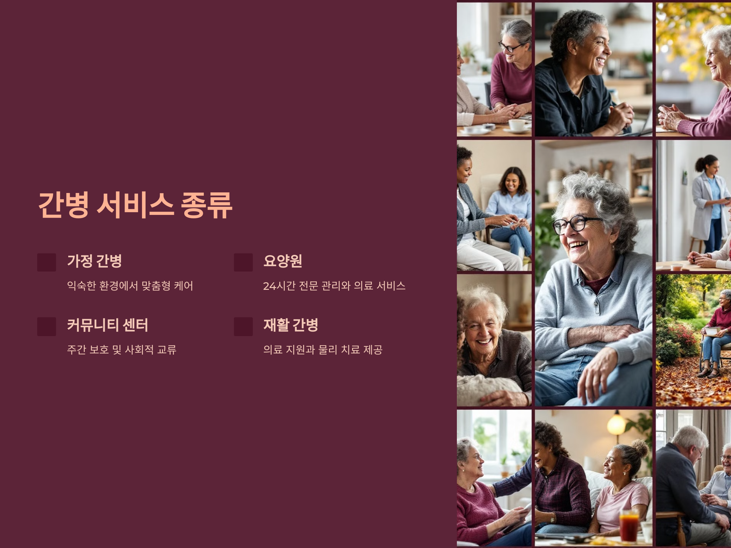 - 요양원 간병 서비스: 전문 시설에서 24시간 관리와 의료 서비스를 제공합니다. 신체적, 정서적 케어가 동시에 이루어집니다.