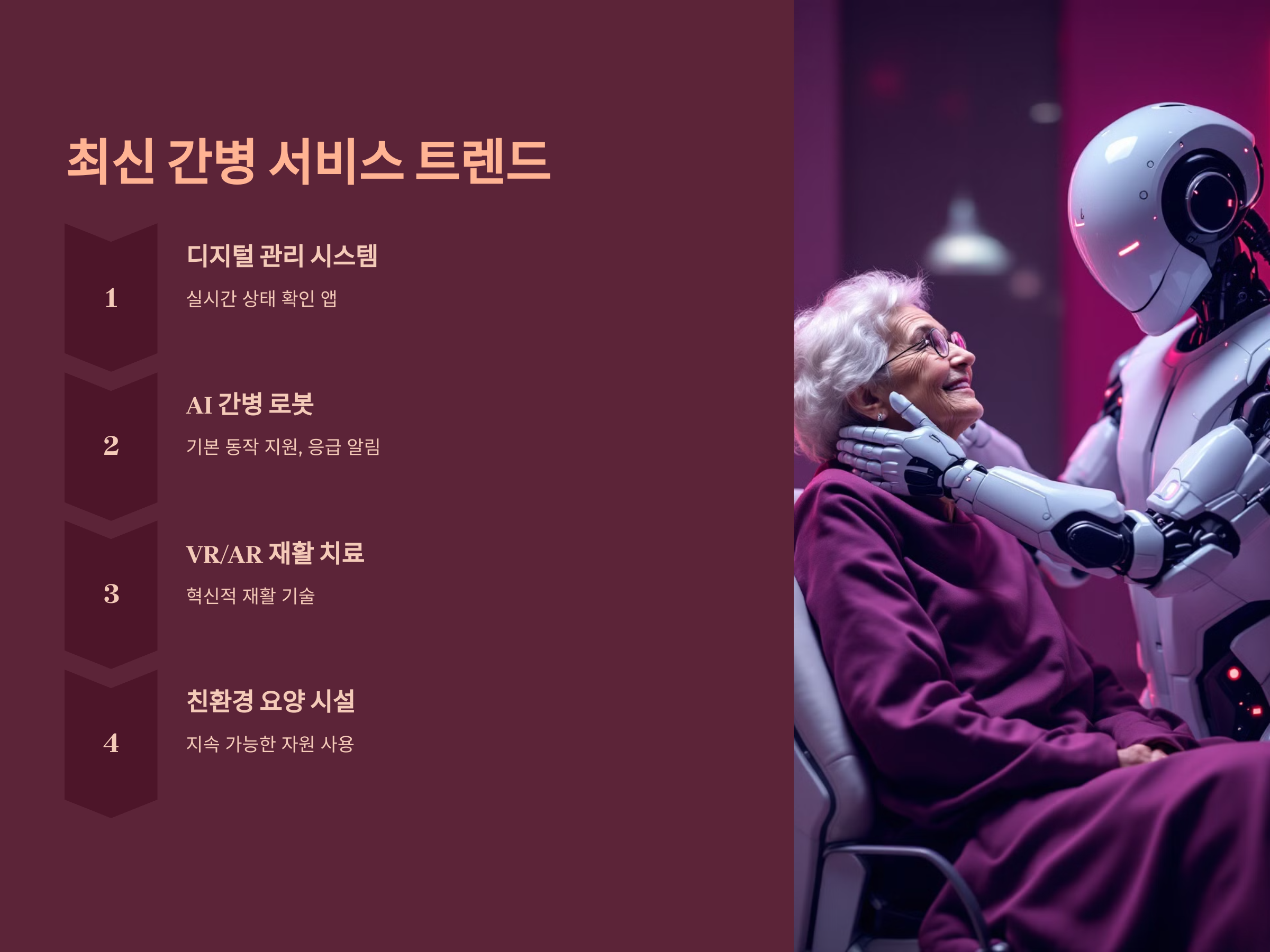 최근 간병 서비스는 기술과 융합하여 혁신적인 방향으로 발전하고 있습니다.