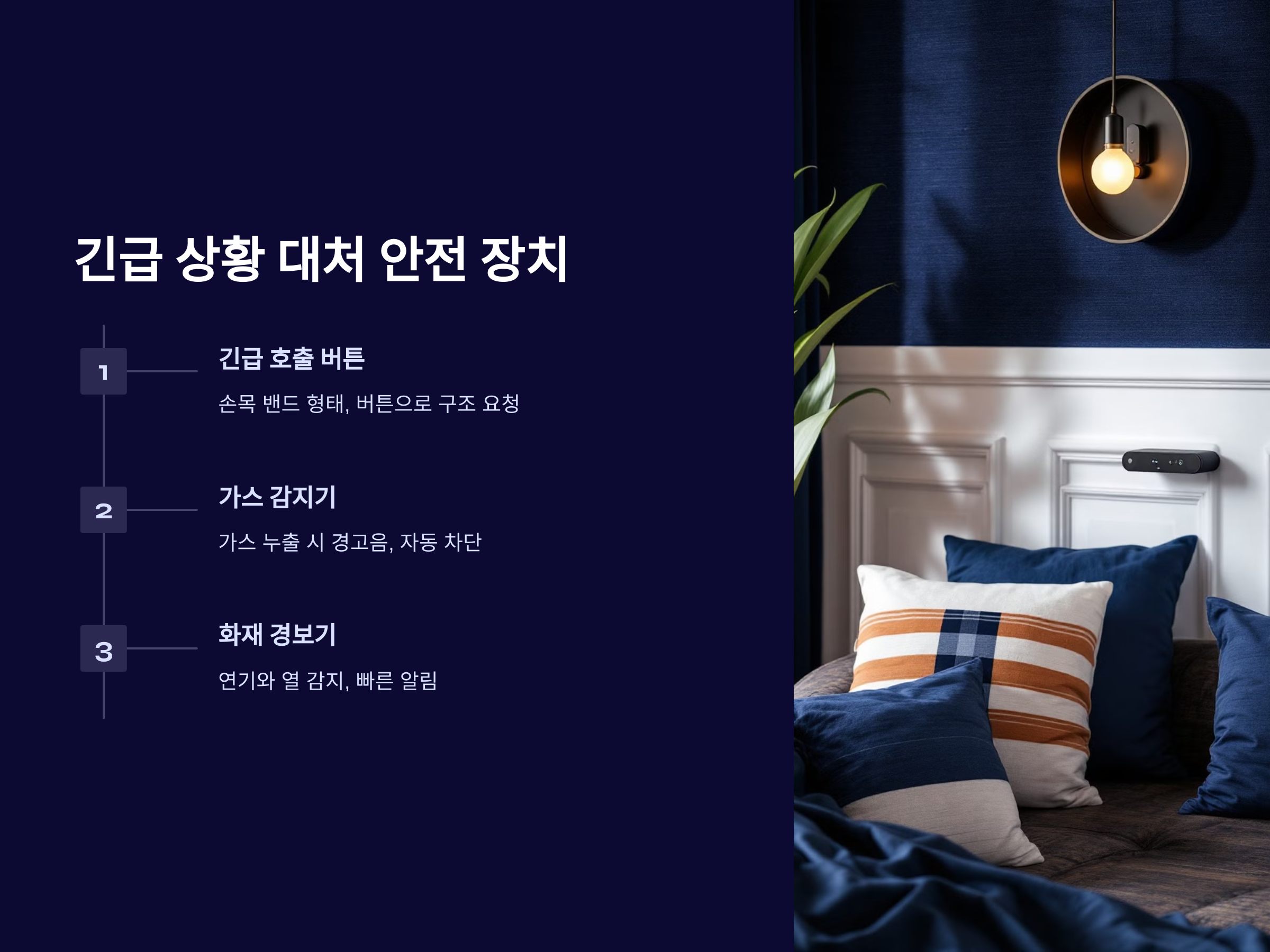 - 스마트 스피커: 음성 명령으로 가전제품을 제어하고 긴급 상황에서 SOS 호출이 가능합니다.