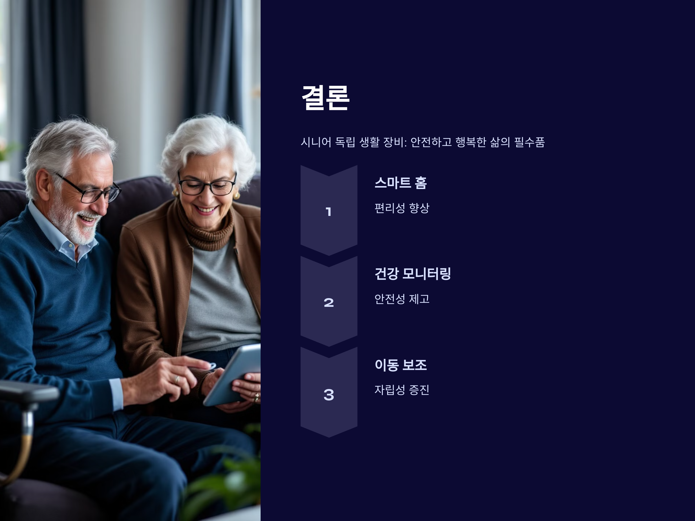 시니어들의 독립 생활을 돕는 장비들은 날로 발전하고 있으며, 이들은 단순한 도구를 넘어 안전하고 행복한 삶을 지원하는 필수품으로 자리 잡았습니다. 스마트 홈 기술, 웨어러블 장치, 이동 보조 기기 등 다양한 기술이 시니어들에게 자립적인 일상을 제공합니다. 앞으로도 기술 발전과 함께 더 많은 가능성이 열릴 것입니다.