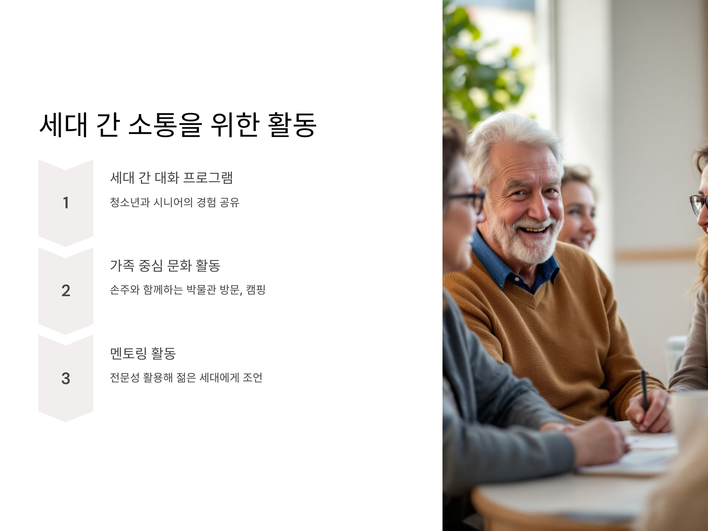 세대 간 소통은 시니어와 젊은 세대 모두에게 긍정적인 영향을 미칩니다.