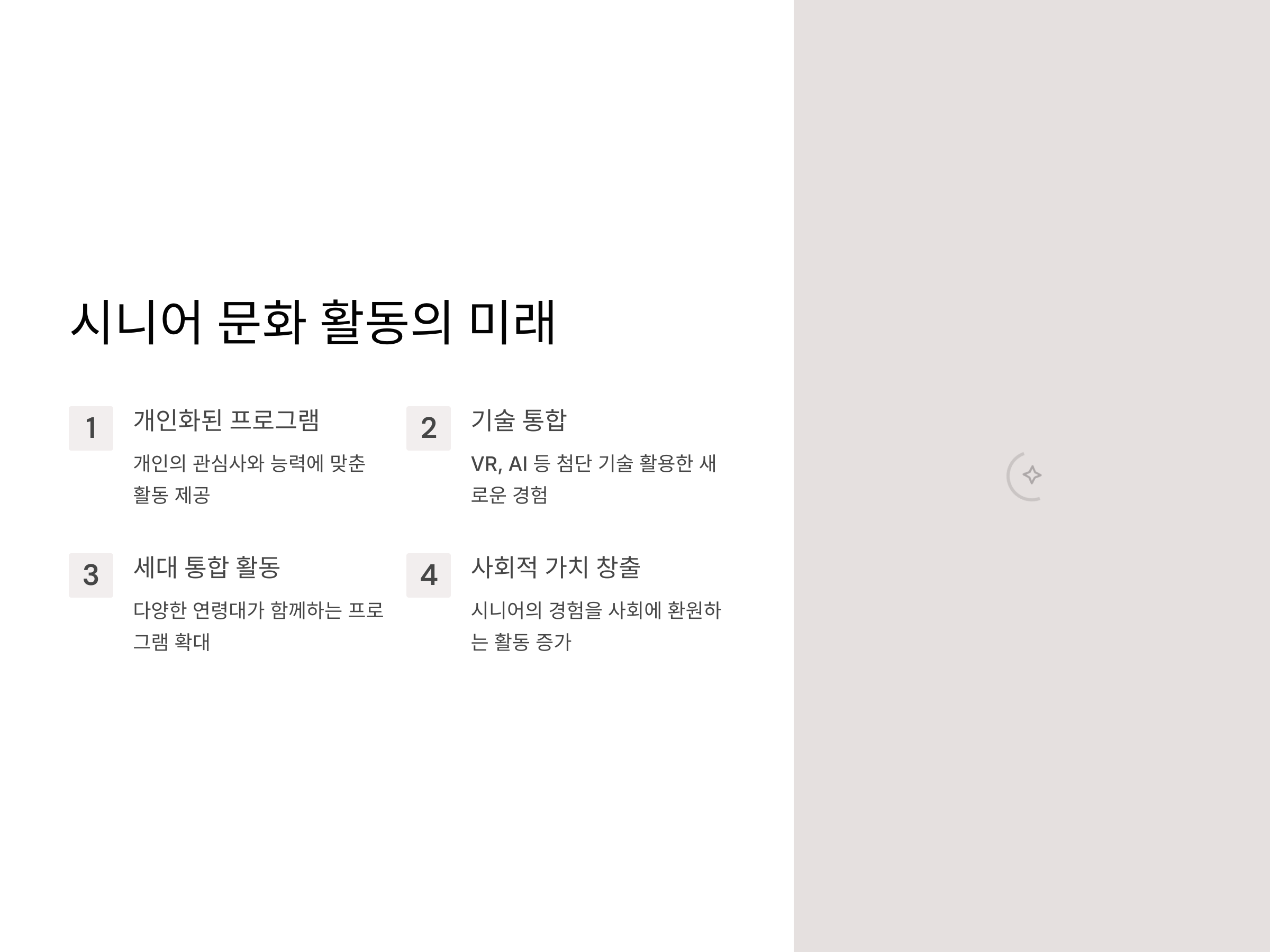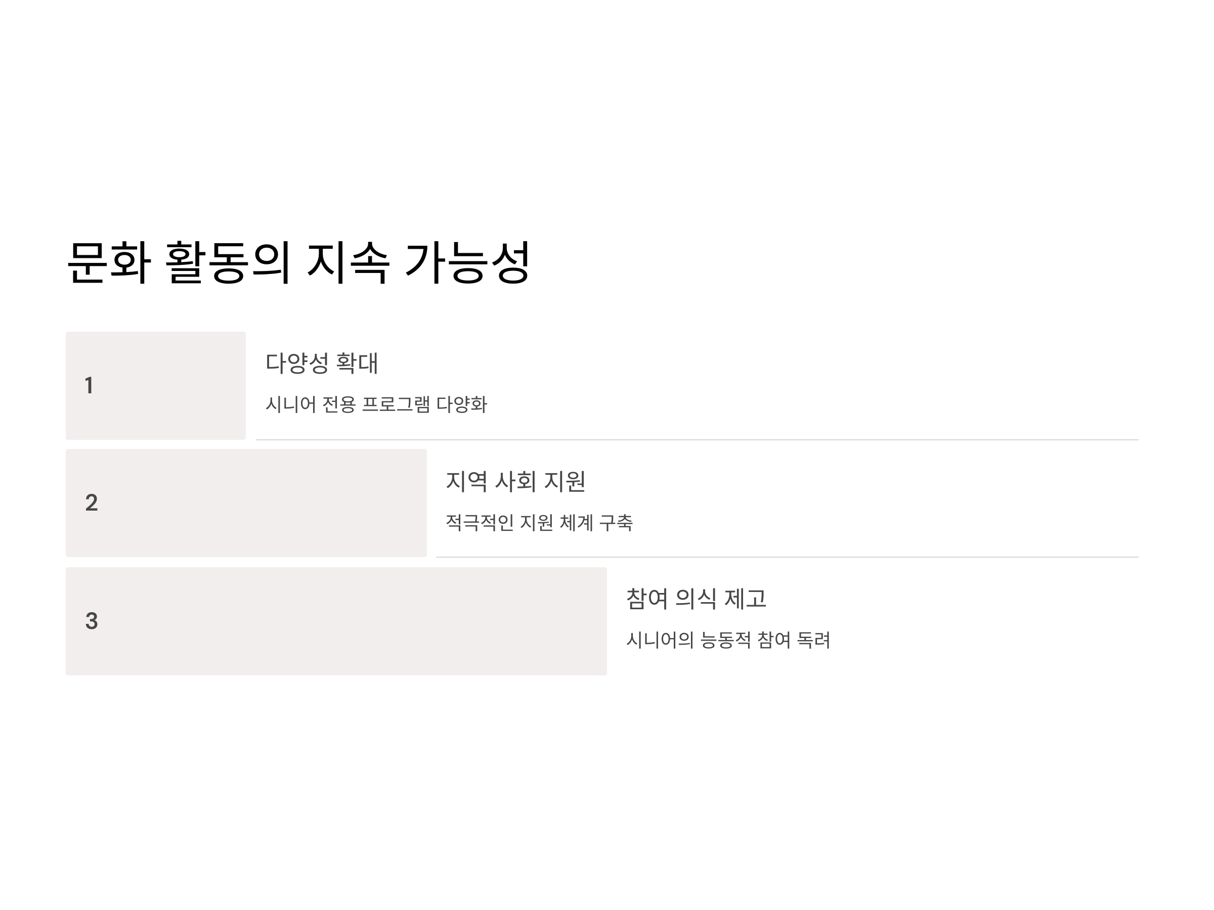 모든 문화 활동이 꾸준히 이어지기 위해서는 지속 가능한 환경을 만들어야 합니다. 시니어 전용 프로그램의 다양성 확대, 지역 사회의 적극적인 지원, 시니어의 참여 의식 제고 등이 필요합니다.