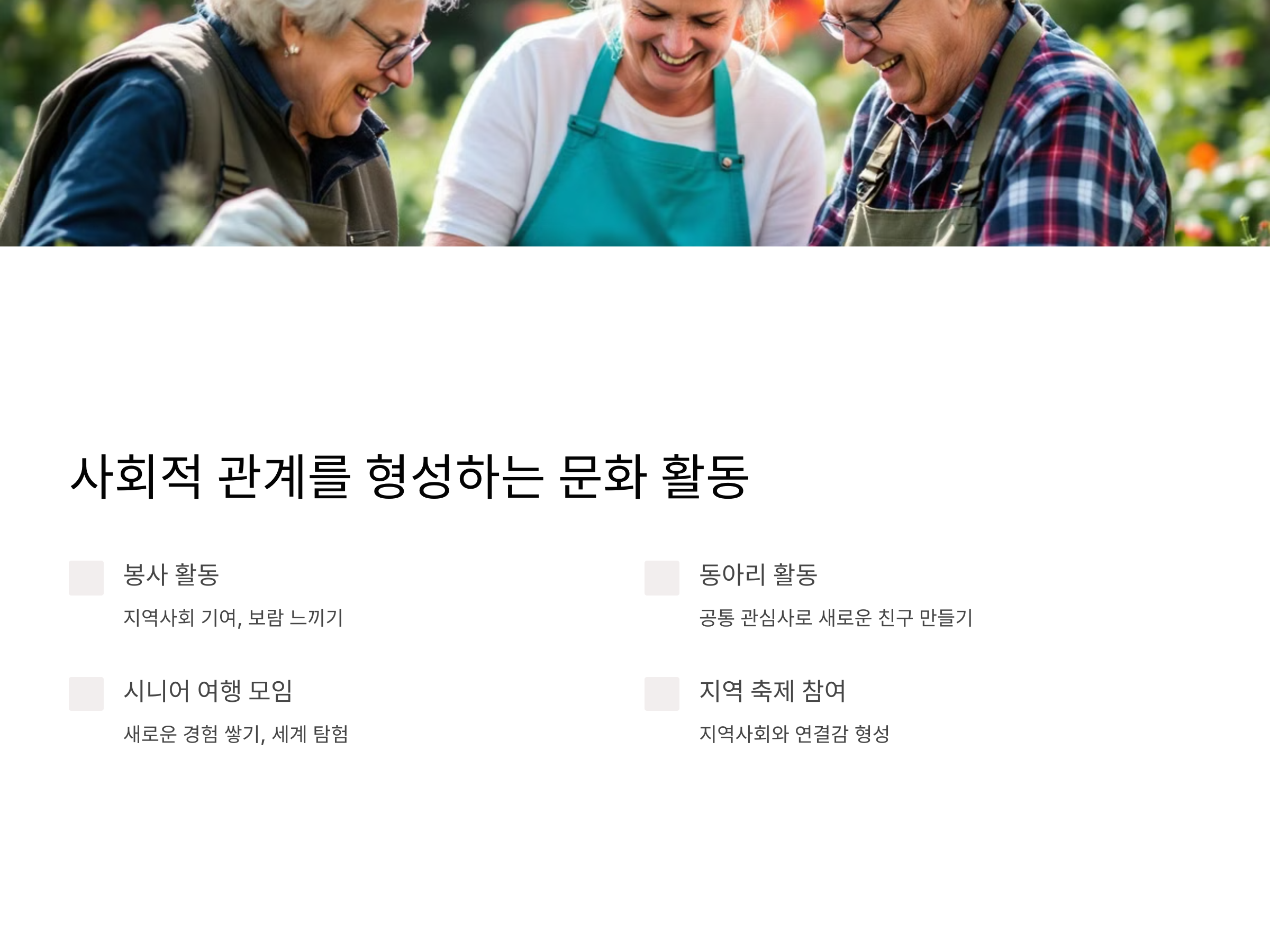 - 시니어 여행 모임: 국내외를 여행하며 새로운 풍경을 보고 경험을 쌓는 기회를 제공합니다.