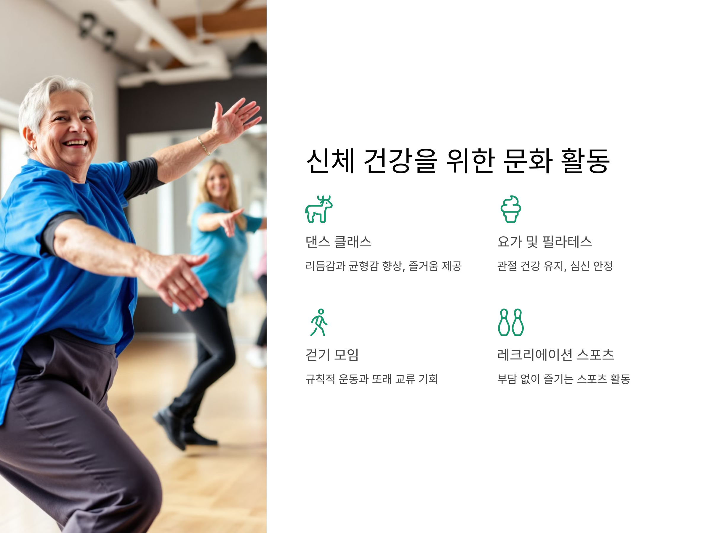 시니어들에게 신체적 건강은 삶의 질과 직결됩니다. 문화 활동 중에서도 신체를 움직이고 건강을 유지할 수 있는 활동은 매우 중요합니다.