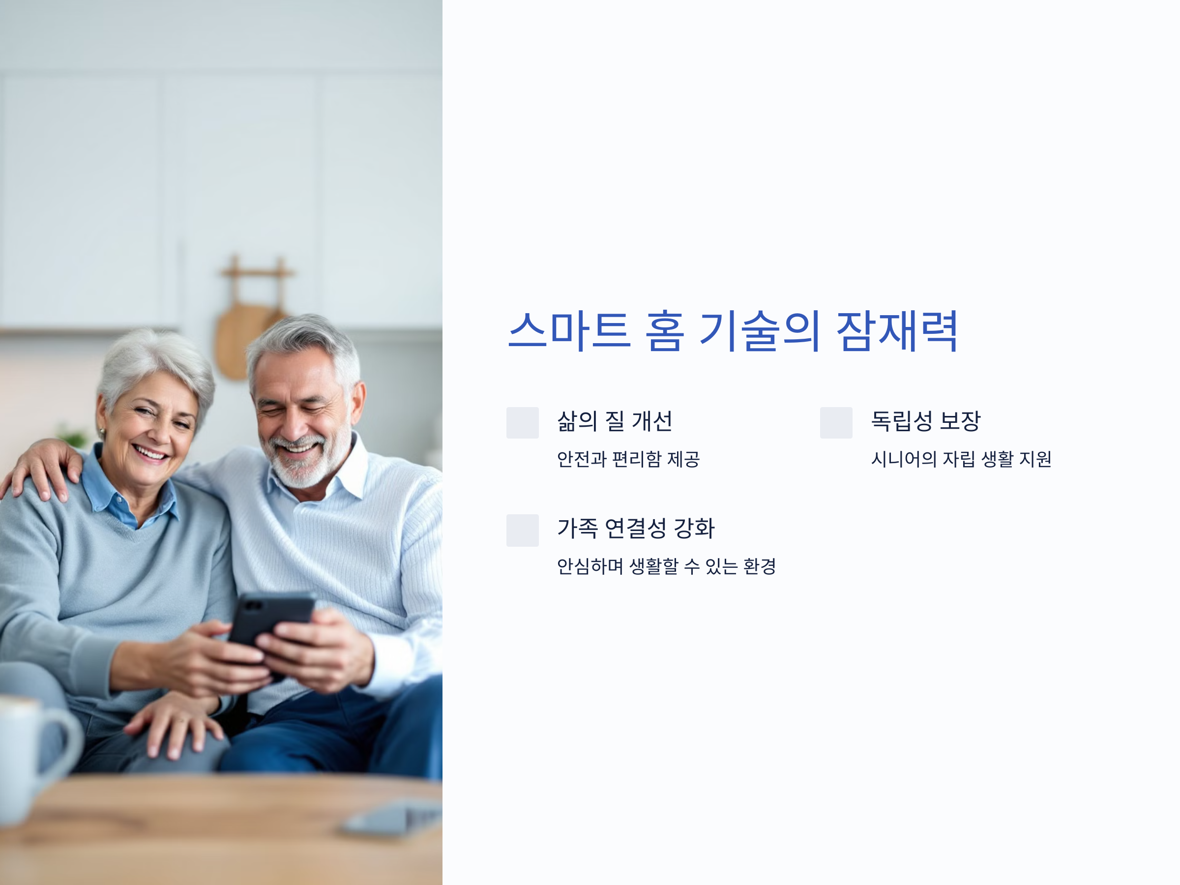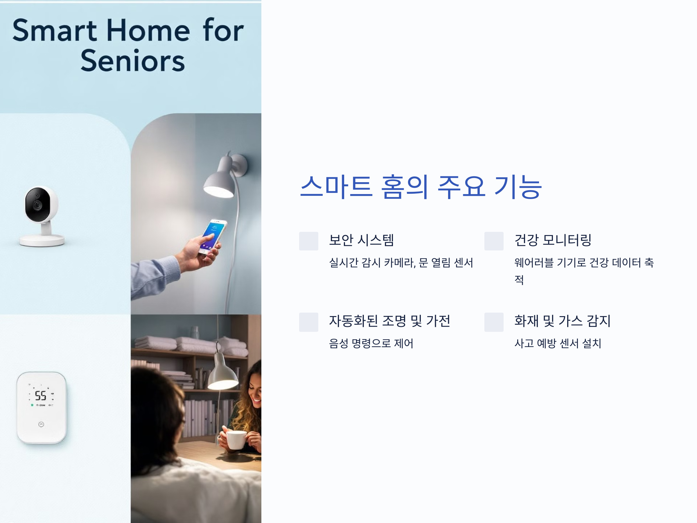 스마트 홈 기술은 시니어의 생활 공간을 더욱 안전하고 편리하게 만들어줍니다.