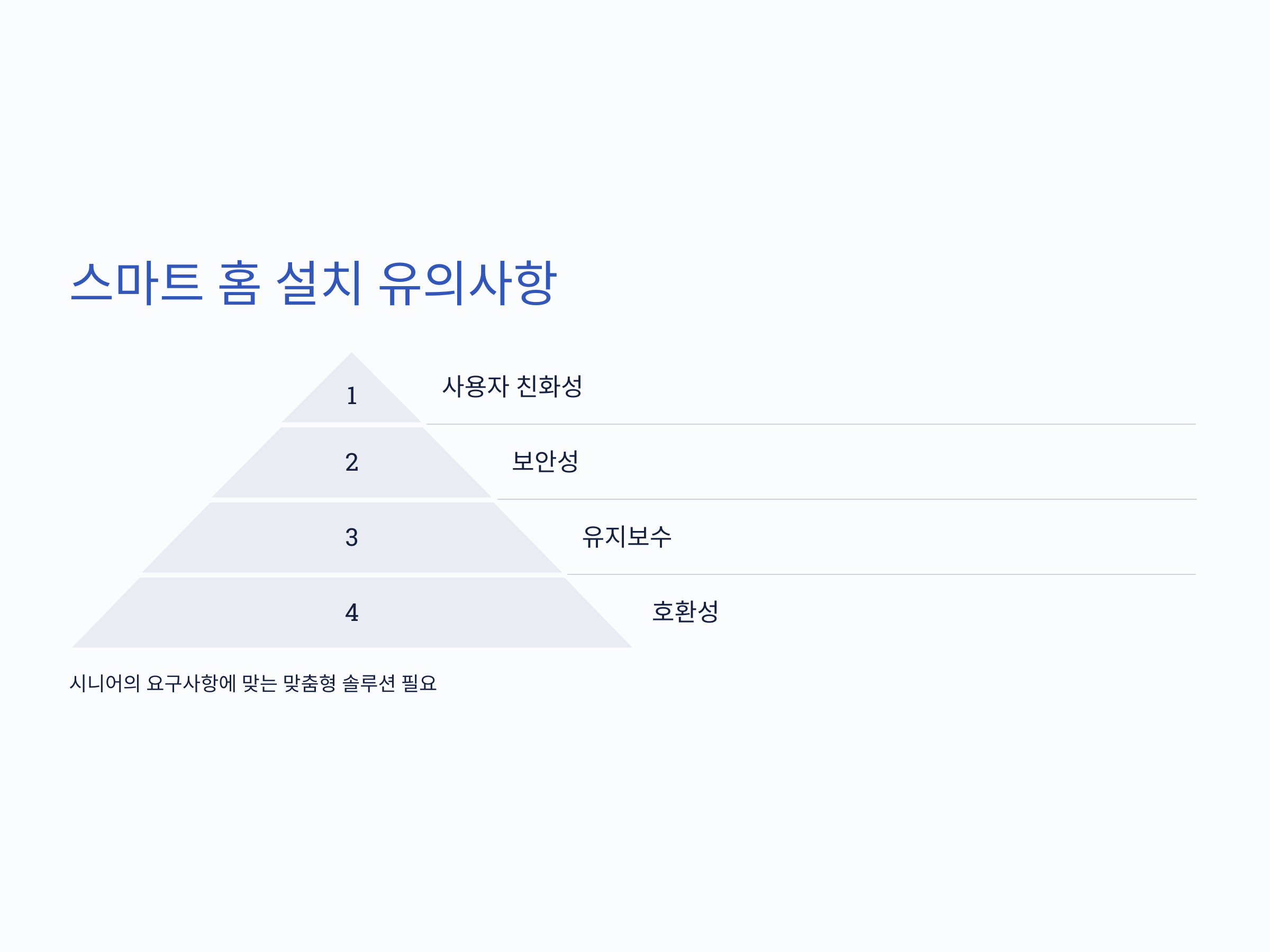 스마트 홈 기술을 시니어의 주거 공간에 도입할 때 몇 가지 중요한 요소를 고려해야 합니다.