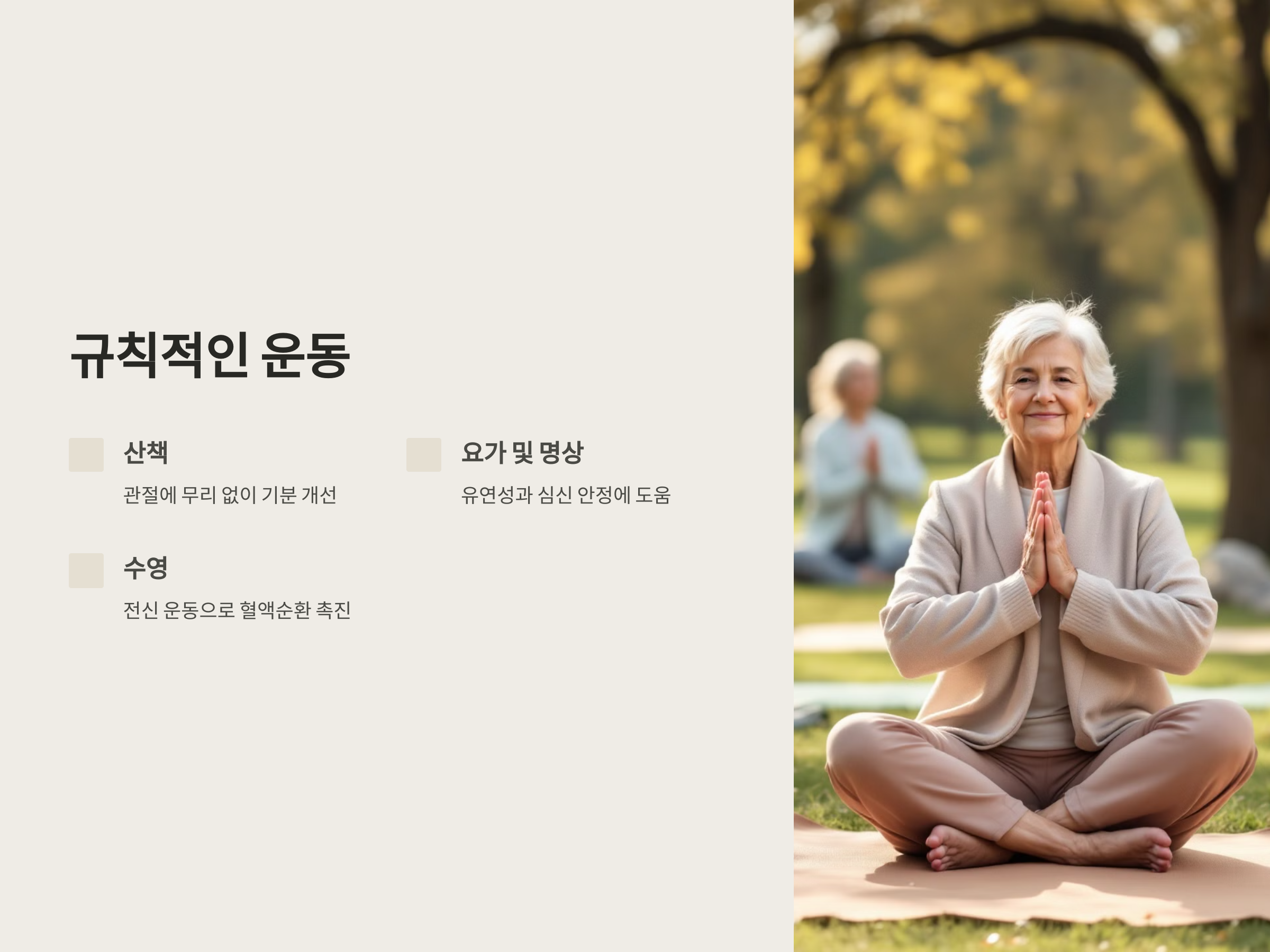 - 요가 및 명상: 유연성과 심신 안정에 도움을 줍니다. 특히 호흡 운동은 스트레스 감소 효과가 있습니다.