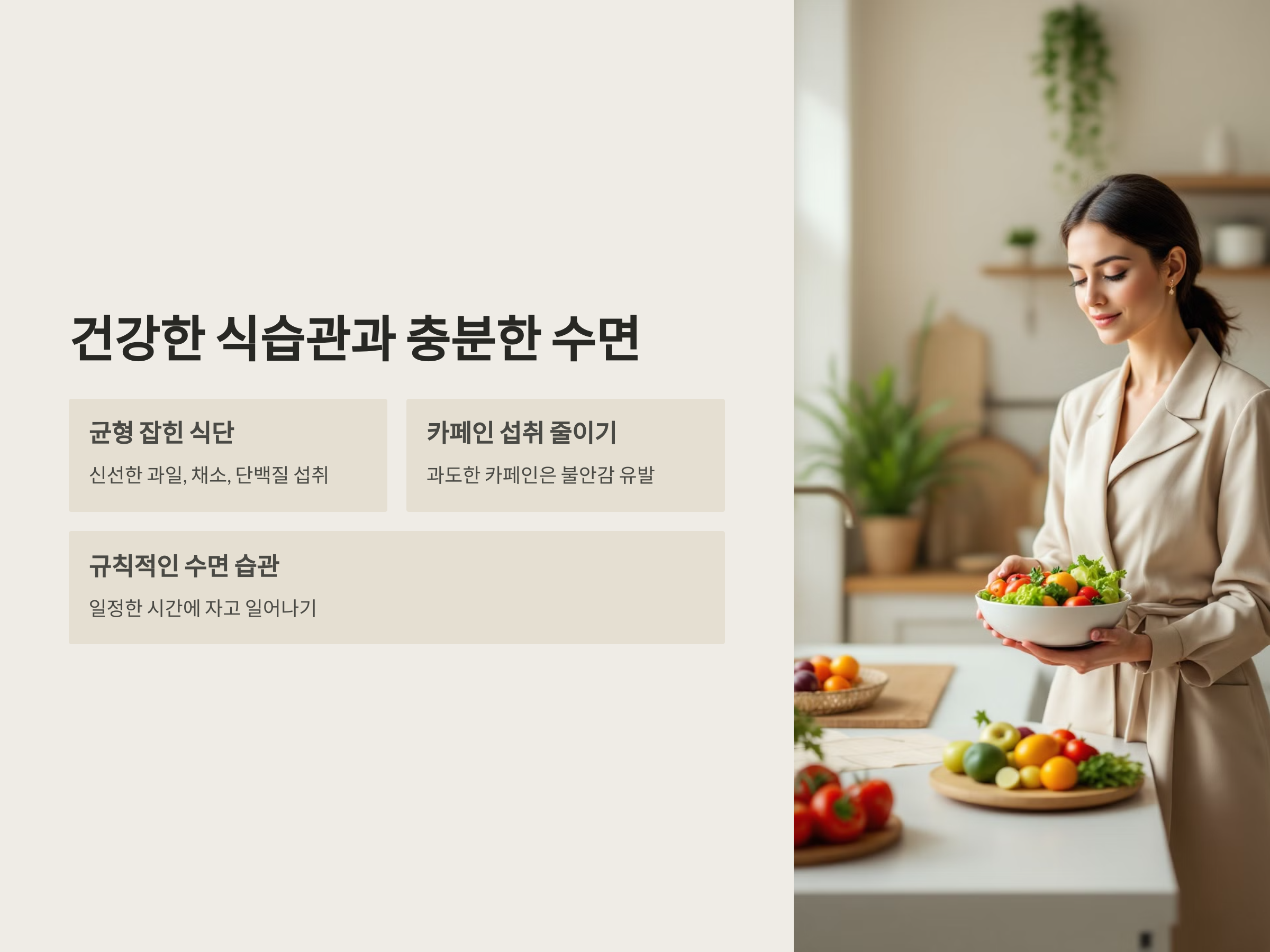- 카페인 섭취 줄이기: 과도한 카페인은 불안감을 유발할 수 있으므로 제한이 필요합니다.