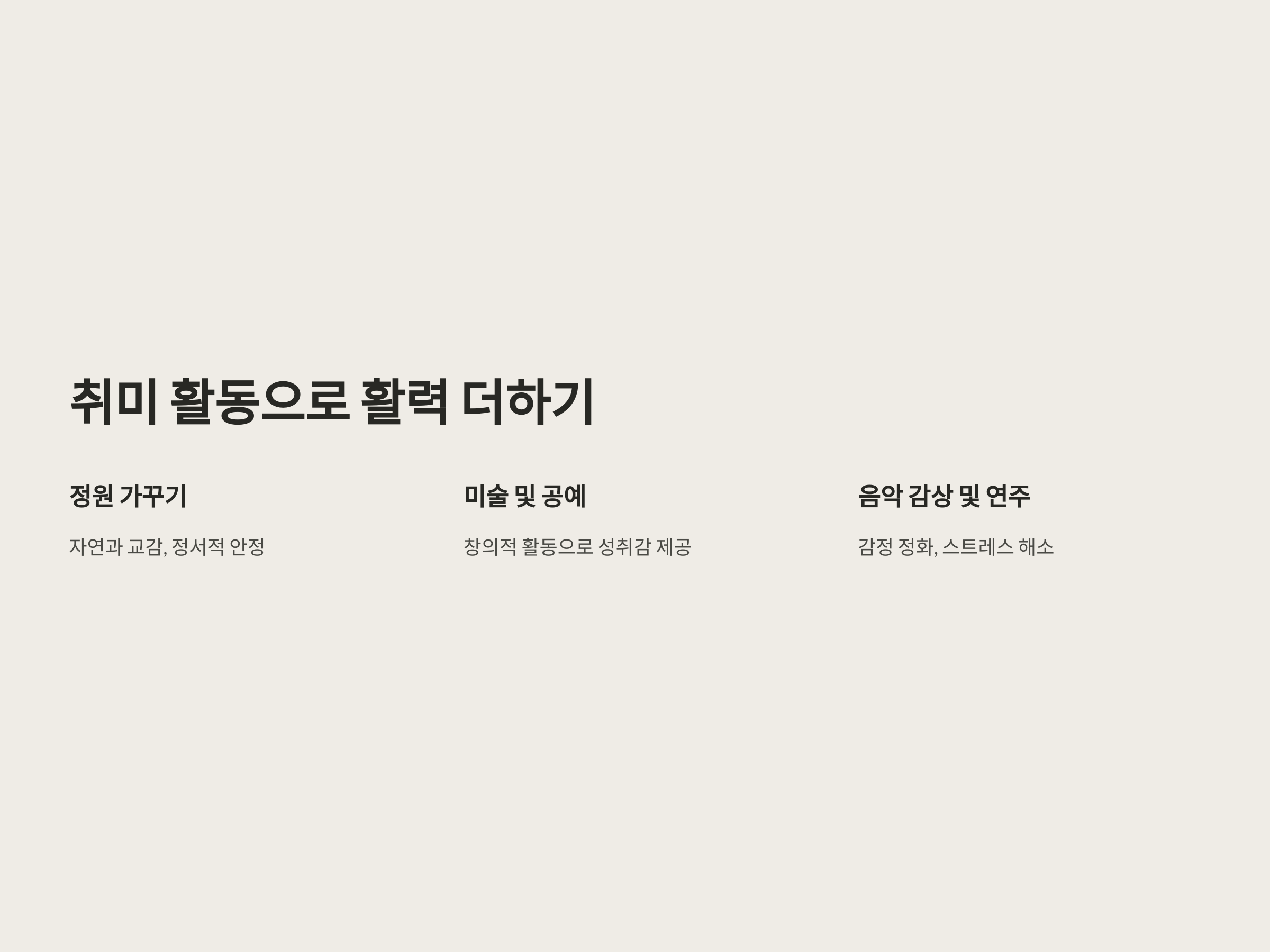 - 정원 가꾸기: 자연과 교감하며 정서적 안정감을 느낄 수 있습니다.